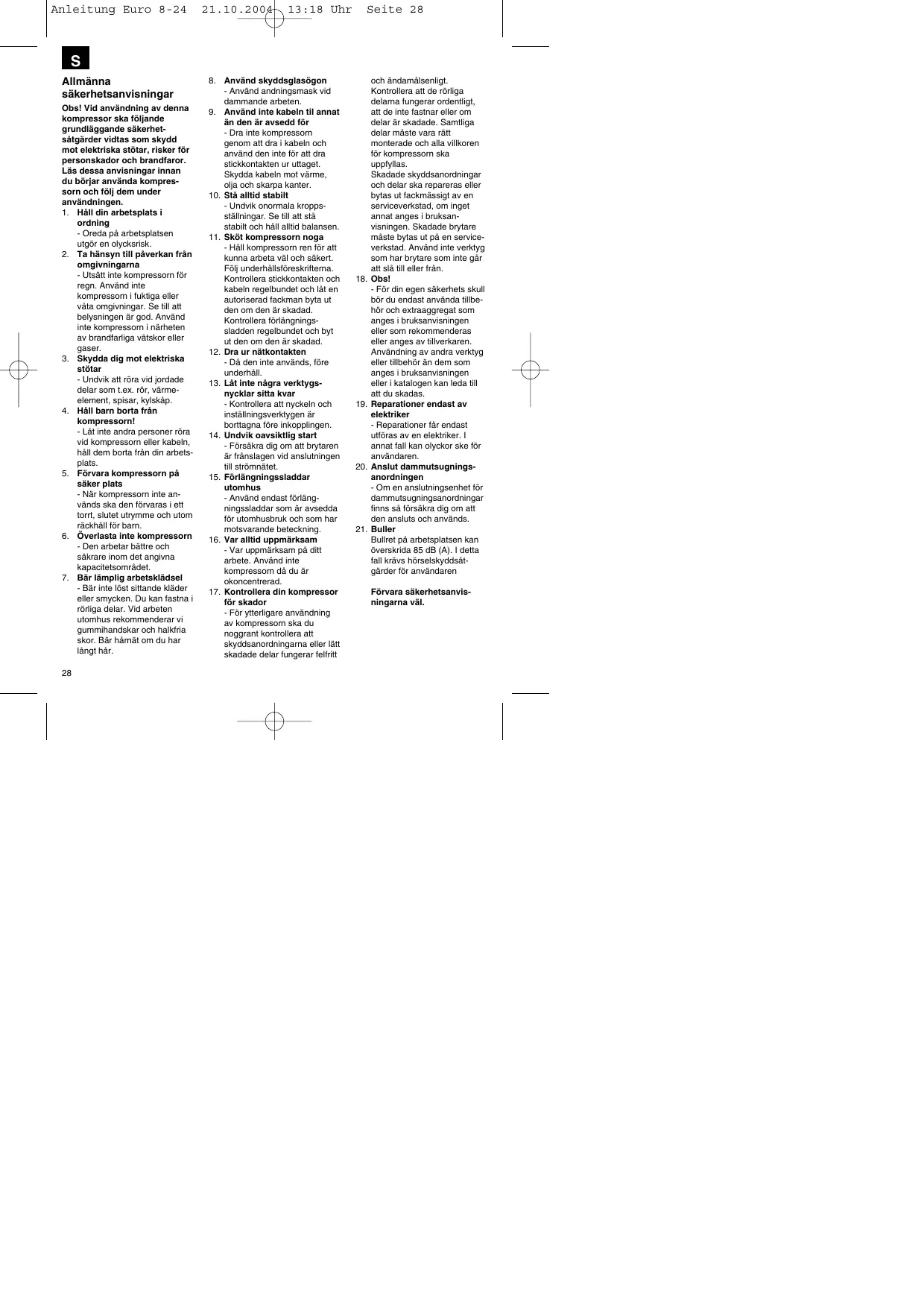 1. Maintenez la zone de travail en ordre. - Le désordre dans la zone de travail augmente le risque d’accident. 2. Prenez les influences de l’environnement en considération. N’exposez pas le compresseur à la pluie. Ne l’utilisez pas dans un environnement humide ou détrempé. Veillez à un bon éclairage. N’utilisez pas le compresseur à proximité de liquides ou gaz inflammables. 3. Protégez-vous contre le choc électrique. - Evitez le contact avec des pièces mises à la terre, telles que les tubes, les appareils de chauffage, les cuisinières électriques ou les réfrigérateurs. 4. Tenez les enfants éloignés! - Prenez soin que d’autres personnes ne touchent pas le compresseur ou le câble. Tenez-les à l’écart de votre zone de travail. 5. Conservez votre compresseur à un endroit sûr. - Il est conseillé de conserver le compresseur non utilisé dans un local sec et fermé et inaccessible aux enfants. 6. Ne surchargez pas votre compresseur. - Vous travaillez mieux et plus sûrement dans la gamme de puissance indiquée. 7. Portez des vêtements de travail appropriés. - Ne portez pas de vêtements larges ou de bijoux. Ils pourraient être happés par des pièces mobiles. Il est recommandable de porter des gants en caoutchouc et des chaussures antiglissantes pendant les travaux à l’extérieur. Si vous avez les cheveux longs, portez un filet. 12