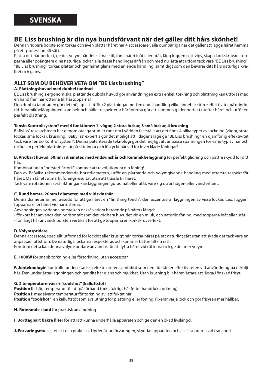 A. Plattningshuvud med dubbel tandrad BE Liss brushing’s ergonomiska, plattande dubbla huvud gör användningen extra enkel: torkning och plattning kan utföras med en hand från hårrötterna till hårtopparna! Den dubbla tandraden gör det möjligt att utföra 2 plattningar med en enda handling vilket innebär större effektivitet på mindre tid. Keramikbeläggningen som helt och hållet respekterar hårfibrerna gör att kammen glider perfekt utefter håret och utför en perfekt plattning. Tensio Kontrollsystem® med 4 funktioner: 1. vågor, 2 stora lockar, 3 små lockar, 4 krusning BaByliss’ researchteam har genom otaliga studier runt om i världen fastställt att det finns 4 olika typer av lockning (vågor, stora lockar, små lockar, krusning). BaByliss’ expertis gör det möjligt att i dagens läge ge ”BE Liss brushing” en ojämförlig effektivitet tack vare Tensio Kontrollsystem®. Denna patenterade teknologi gör det möjligt att anpassa spänningen för varje typ av hår och utföra en perfekt plattning: slut på slitningar och lösryckt hår vid för invecklade föningar! B. Vridbart huvud, 50mm i diameter, med vildsvinshår och Keramikbeläggning för perfekt glidning och bättre skydd för ditt hår. Kombinationen ”borste/hårtork” kommer att revolutionera din föning! Den av BaByliss rekommenderade borstdiametern, utför en plattande och volymgivande handling med yttersta respekt för håret. Man får ett utmärkt föningsresultat utan att trassla till håret. Tack vare rotationen i två riktningar kan läggningen göras inåt eller utåt, vare sig du är höger- eller vänsterhänt. C. Rund borste, 20mm i diameter, med vildsvinshår Denna diameter är mer avsedd för att ge håret en ”finishing touch”: den accentuerar läggningen av vissa lockar. t.ex. luggen, topparna eller håret vid hårrötterna. Användningen av denna borste kan också variera beroende på hårets längd: - för kort hår används den horisontalt som det vridbara huvudet vid en mjuk, och naturlig föning, med topparna inåt eller utåt. - för långt hår används borsten vertikalt för att ge topparna en korkskruvseffekt. D. Volymspridare Denna accessoar, speciellt utformad för lockigt eller krusigt hår, torkar håret på ett naturligt sätt utan att skada det tack vare en anpassad luftström. De naturliga lockarna respekteras och kommer bättre till sin rätt. Förutom detta kan denna volymspridare användas för att lyfta håret vid rötterna och ge det mer volym. E. 1000W för snabb torkning eller förtorkning, utan accessoar F. Jonteknologin kontrollerar den statiska elektriciteten samtidigt som den förstärker effektiviteten vid användning på osköljt hår. Den underlättar läggningen och ger ditt hår glans och mjukhet. Utan krusning blir håret lättare att lägga i önskad frisyr. G. 2 temperaturnivåer + ”coolshot” (kalluftstöt) Position II : hög temperatur för att på förhand torka fuktigt hår (efter handdukstorkning) Position I: medelvarm temperatur för torkning av lätt fuktat hår Position ”coolshot”: en kalluftstöt som avslutning för plattning eller föning. Fixerar varje lock och gör frisyren mer hållbar. H. Roterande sladd för praktisk användning I. Borttagbart bakre filter för att lätt kunna underhålla apparaten och ge den en ökad livslängd. J. Förvaringsetui: estetiskt och praktiskt. Underlättar förvaringen, skyddar apparaten och accessoarerna vid transport.