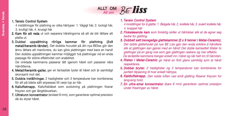 Alt om 1. Te n si o C on t rol System 4 inställningar för plattning av olika hårtyper: 1. Vågigt hår, 2. lockigt hår, 3. krulligt hår, 4. krusigt hår 2. K am fö r at t reda ut och separera hårslingorna så att de blir lättare att platta ut. 3. D u b b e l u p p s ä t t n i n g r ö r l i g a k a m m a r f ö r p l a t t n i n g ( 2 x 9 m e t a l l / k e r a m i k - t ä n d er ). Det dubbla huvudet på din nya BEliss gör den ännu lättare att manövrera, du kan göra plattningen med bara en hand! Den dubbla uppsättningen kammar möjliggör två plattningar vid en enda passage för större effektivitet och snabbhet. De vinklade kammarna passerar lätt igenom håret och passerar nära hårrötterna. 4. M e t a l l / k e r a m i k - g a l l e r, ger en fantastisk lyster åt håret och är samtidigt skonsamt mot det. 5. D u bbl a i n s t äl l n i n ga r. 2 hastigheter och 3 temperaturer kan kombineras för att på bästa sätt anpassas till varje typ av hår. 6. K al l u ft s k n app . Kalluftsblåset som avslutning på plattningen fixerar frisyren och ger långtidsverkan. 7. U l t r a t u n n k o n c e n t r a t o r (endast 8 mm), som garanterar optimal precision då du stylar håret.