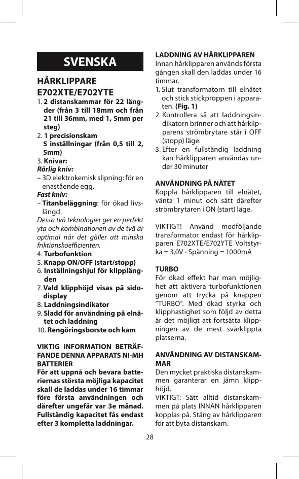 Koppla hårklipparen till elnätet, vänta 1 minut och sätt därefter strömbrytaren i ON (start) läge. VIKTIGT! Använd medföljande transformator endast för hårklipparen E702XTE/E702YTE Voltstyrka = 3,0V - Spänning = 1000mA TURBO För ökad effekt har man möjlighet att aktivera turbofunktionen genom att trycka på knappen ”TURBO”. Med ökad styrka och klipphastighet som följd av detta är det möjligt att fortsätta klippningen av de mest svårklippta platserna. VIKTIG INFORMATION BETRÄFFANDE DENNA APPARATS NI-MH BATTERIER För att uppnå och bevara batteriernas största möjliga kapacitet skall de laddas under 16 timmar före första användningen och därefter ungefär var 3e månad. Fullständig kapacitet fås endast efter 3 kompletta laddningar.