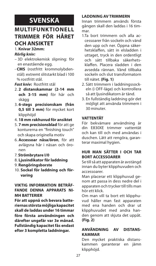 E830XE est waterproof. Elle s’utilise même sous la douche et son entretien facile vous garantit une hygiène maximale. PLACEMENT ET RETRAIT DES ACCESSOIRES Assurez-vous que l’appareil est éteint avant de changer les têtes tondeuse et d’accessoires. Pour placer une tête, ajuster le bas de l’accessoire sur l’appareil et emboîter toute la tête jusqu’au clic. Pour retirer une tête, tenir la poignée de l’appareil dans une main et enlever la tête avec l’autre main en la poussant vers le haut (Fig.2).