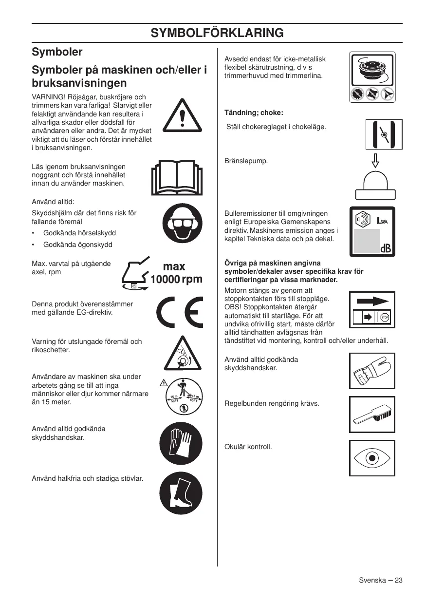 VARNING! Var alltid uppmärksam på varningssignaler eller tillrop när hörselskydd används. Tag alltid av hörselskydden så snart motorn stoppats. HJÄLM Skyddshjälm där det finns risk för fallande föremål HÖRSELSKYDD Hörselskydd med tillräcklig dämpeffekt ska användas. ÖGONSKYDD Godkända ögonskydd skall alltid användas. Används visir måste även godkända skyddsglasögon användas. Med godkända skyddsglasögon menas de som uppfyller standard ANSI Z87.1 för USA eller EN 166 för EU-länder. HANDSKAR Handskar ska användas när det behövs, t ex vid montering av skärutrustning. STÖVLAR Använd halkfria och stadiga stövlar. Svenska – 27