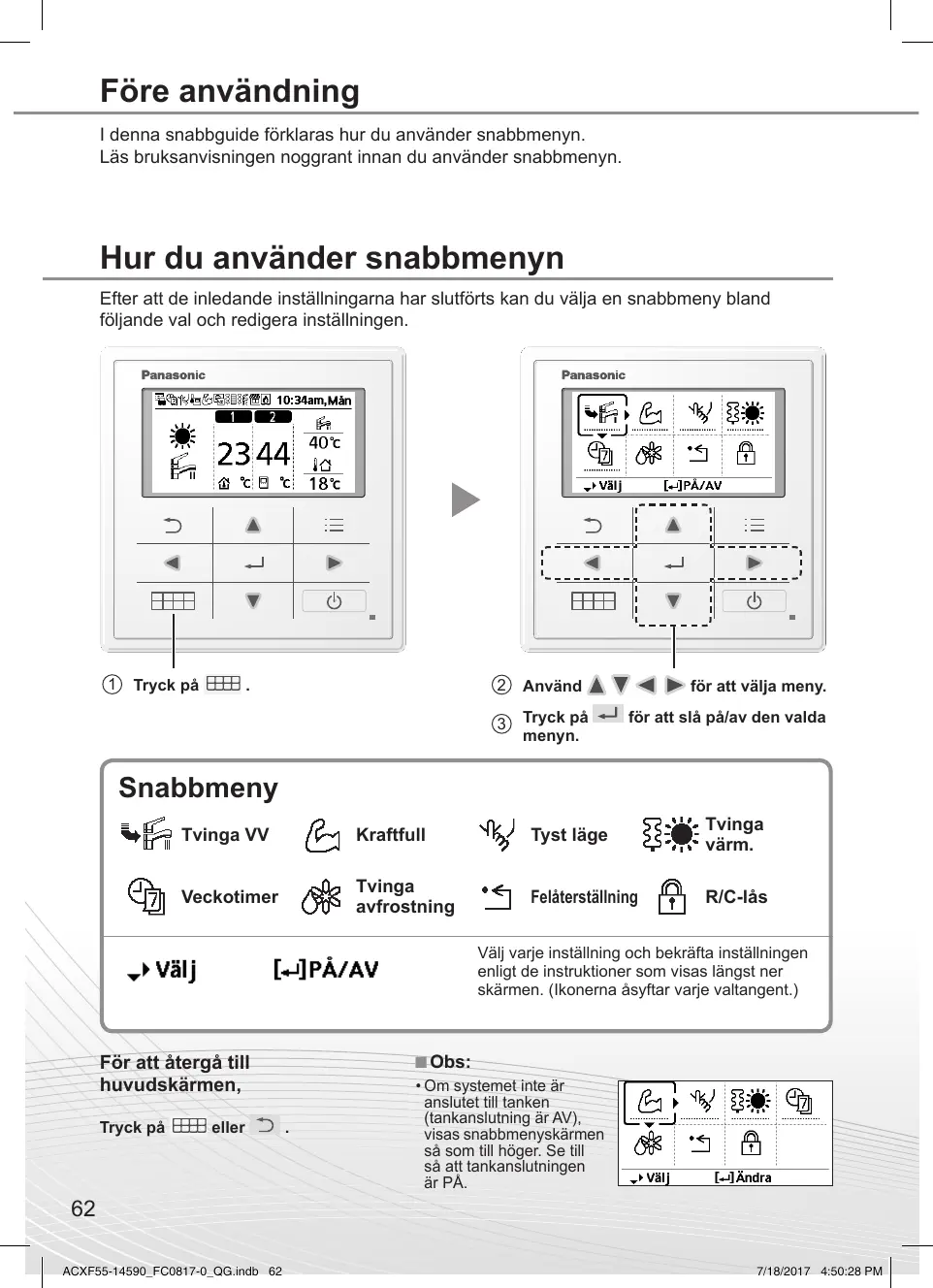 7/18/2017 4:50:29 PM Hur du använder snabbmenyn Välj för att tvinga på värmaren. Tryck på