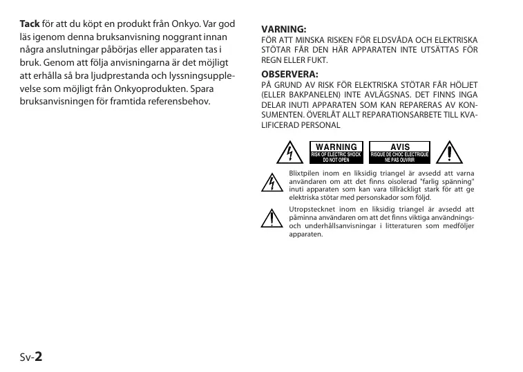 Ne touchez jamais cet appareil avec des mains mouillées—Ne manipulez jamais cet appareil ou son cordon d’alimentation avec des mains mouillées ou humides. Si de l’eau ou tout autre liquide pénètre à l’intérieur de l’appareil, faites-le vérifier par votre revendeur Onkyo.