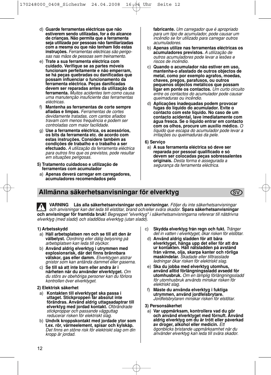 a) A sua ferramenta eléctrica só deve ser reparada por pessoal qualificado e só devem ser colocadas peças sobressalentes originais. Desta forma é assegurada a segurança da ferramenta eléctrica. Allmänna säkerhetsanvisningar för elverktyg VARNING Läs alla säkerhetsanvisningar och anvisningar. Följer du inte säkerhetsanvisningar och anvisningar kan det leda till elstötar, brand och/eller svåra skador. Spara säkerhetsanvisningar och anvisningar för framtida bruk! Begreppet "elverktyg" i säkerhetsanvisningarna refererar till nätdrivna elverktyg (med sladd) och sladdlösa elverktyg (utan sladd).