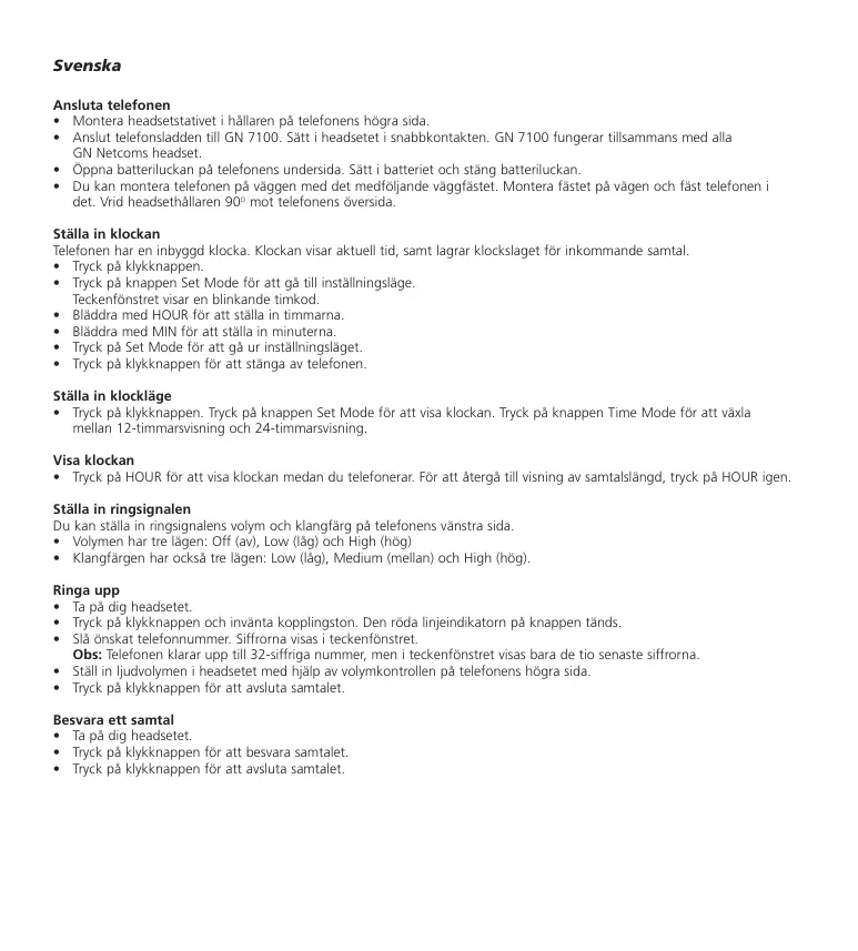 Svenska Ansluta telefonen • Montera headsetstativet i hållaren på telefonens högra sida. • Anslut telefonsladden till GN 7100. Sätt i headsetet i snabbkontakten. GN 7100 fungerar tillsammans med alla GN Netcoms headset. • Öppna batteriluckan på telefonens undersida. Sätt i batteriet och stäng batteriluckan. • Du kan montera telefonen på väggen med det medföljande väggfästet. Montera fästet på vägen och fäst telefonen i det. Vrid headsethållaren 90O mot telefonens översida. Ställa in klockan Telefonen har en inbyggd klocka. Klockan visar aktuell tid, samt lagrar klockslaget för inkommande samtal. • Tryck på klykknappen. • Tryck på knappen Set Mode för att gå till inställningsläge. Teckenfönstret visar en blinkande timkod. • Bläddra med HOUR för att ställa in timmarna. • Bläddra med MIN för att ställa in minuterna. • Tryck på Set Mode för att gå ur inställningsläget. • Tryck på klykknappen för att stänga av telefonen. Ställa in klockläge • Tryck på klykknappen. Tryck på knappen Set Mode för att visa klockan. Tryck på knappen Time Mode för att växla mellan 12-timmarsvisning och 24-timmarsvisning. Visa klockan • Tryck på HOUR för att visa klockan medan du telefonerar. För att återgå till visning av samtalslängd, tryck på HOUR igen. Ställa in ringsignalen Du kan ställa in ringsignalens volym och klangfärg på telefonens vänstra sida. • Volymen har tre lägen: Off (av), Low (låg) och High (hög) • Klangfärgen har också tre lägen: Low (låg), Medium (mellan) och High (hög). Ringa upp • Ta på dig headsetet. • Tryck på klykknappen och invänta kopplingston. Den röda linjeindikatorn på knappen tänds. • Slå önskat telefonnummer. Siffrorna visas i teckenfönstret. Obs: Telefonen klarar upp till 32-siffriga nummer, men i teckenfönstret visas bara de tio senaste siffrorna. • Ställ in ljudvolymen i headsetet med hjälp av volymkontrollen på telefonens högra sida. • Tryck på klykknappen för att avsluta samtalet. Besvara ett samtal • Ta på dig headsetet. • Tryck på klykknappen för att besvara samtalet. • Tryck på klykknappen för att avsluta samtalet.