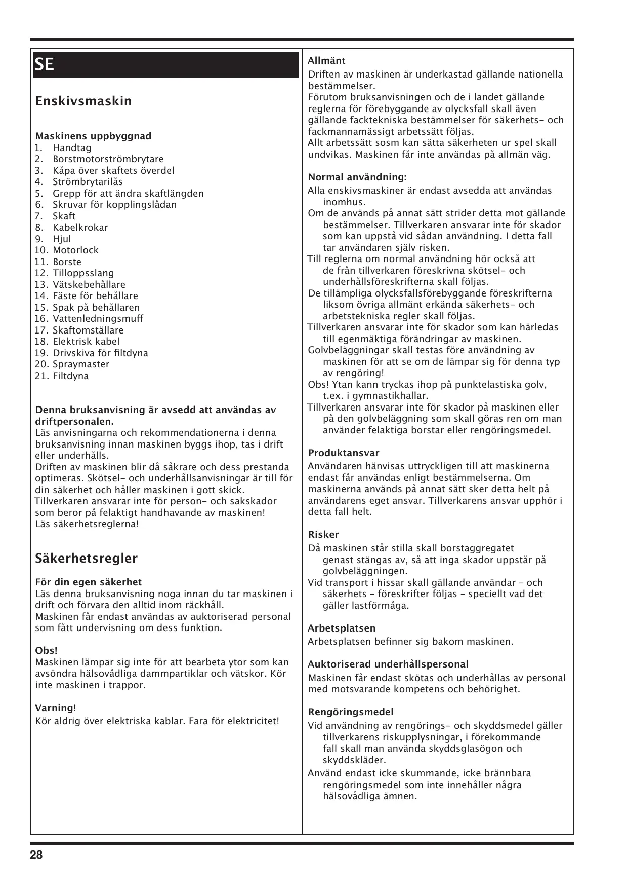 Outre les instructions de service et les réglementations relatives à la prévention des accidents en vigueur dans le pays dʼutilisation, il convient dʼobserver les règles techniques reconnues pour des travaux effectués dans les règles de lʼart et en toute sécurité. Toute utilisation constituant un risque pour la sécurité est interdite. Lʼutilisation de la monobrosse sur des voies publiques et rues est interdite. Utilisation conforme aux dispositions Les monobrosses sont toutes exclusivement réservées à une utilisation à lʼintérieur de bâtiments. Une utilisation autre est considérée comme non conforme. Le fabricant décline toute responsabilité pour les dommages en résultant; le risque est exclusivement supporté par lʼutilisateur. Une utilisation de la monobrosse conformément aux fins auxquelles elle est destinée implique aussi le respect des conditions de service, dʼentretien et de maintenance prescrites par le fabricant. Les prescriptions de prévention des accidents correspondantes ainsi que les règles techniques de sécurité et de travail générales reconnues sont à respecter. Des modifications apportées à la machine excluent la responsabilité du fabricant pour les dommages en résultant. Avant dʼutiliser la machine, les revêtements de sol doivent être contrêlés pour savoir sʼils conviennent à ce procédé de nettoyage! Il doit être tenu compte de la compression des surfaces en présence de sols à élasticité ponctuelle, p. ex. dans les halls de sport! Le fabricant nʼest pas responsable des endommagements de lʼappareil et du revêtement à nettoyer liés à lʼutilisation de brosses et produits de nettoyage inadéquats. Responsabilité en matière de produit Lʼattention de lʼutilisateur est expressément attirée sur le fait que les monobrosses doivent uniquement être utilisées conformément aux fins auxquelles elles sont destinées. Au cas où les monobrosses ne pourraient pas être employées conformément aux dispositions, leur utilisation se fera sous lʼentière responsabilité de lʼutilisateur. Toute responsabilité du fabricant expire dans ce cas. Sources de dangers A lʼarrêt de la monobrosse, le groupe de brosses doit immédiatement être mis hors service pour ne pas endommager les reêtemens de sol. Si la monobrosse est transportée dans des ascenseurs, les consignes dʼutilisation respectivement en vigueur ainsi que les prescriptions de sécurité – et notamment la portance – sont à observer. Poste de travail Le poste de travail se trouve derrière la monobrosse. Personnel autorisé pour lʻentretien La monobrosse doit uniquement être entretenue et maintenue par des personnes en possession dʼautorisations professionelles et légales. Produits de nettoyage