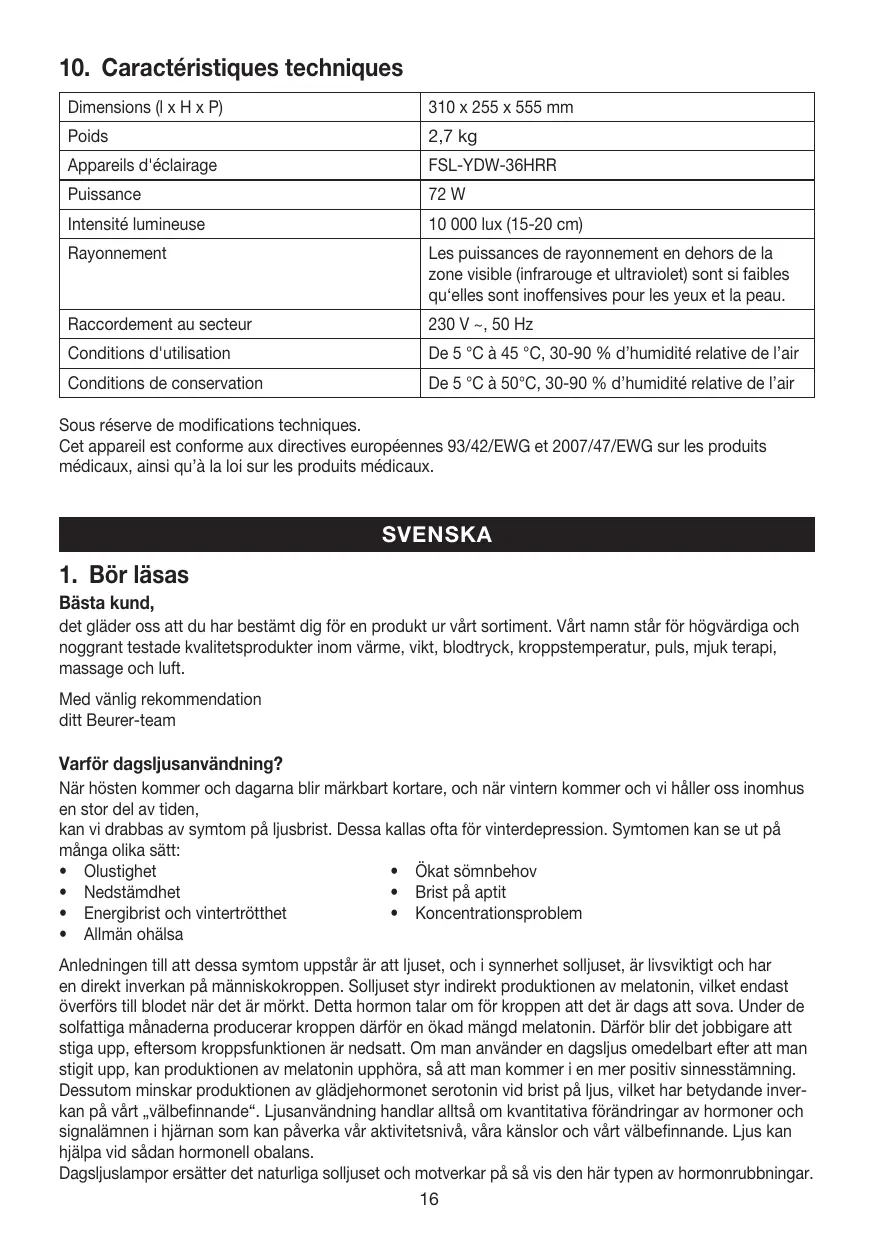 Inom det medicinska området används dagsljuslampor för ljusbehandling mot symtom på ljusbrist. Dagsljuslampor simulerar dagsljus på över 10 000 lux (på 15–20 cm avstånd). Detta ljus kan inverka positivt på människokroppen och kan användas i förebyggande syfte eller för behandling. Vanligt artificiellt ljus är dock inte tillräckligt för att det ska ha någon effekt på hormonnivåerna. På t.ex. ett väl upplyst kontor uppgår belysningsstyrkan endast till 500 lux. Leveransomfång: • Dagsljuslampa • Denna bruksanvisning