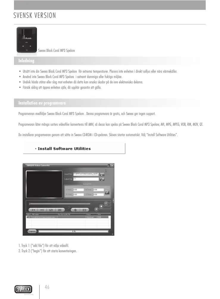 U tsätt inte din Sweex Black Coral MP3 Spelare för extrema temperaturer. Placera inte enheten i direkt solljus eller nära värmekällor. Använd inte Sweex Black Coral MP3 Spelare i extremt dammiga eller fuktiga miljöer. Undvik hårda stötar eller slag mot enheten då detta kan orsaka skador på de inre elektroniska delarna. Försök aldrig att öppna enheten själv, då upphör garantin att gälla. Installation av programvara Programvaran medföljer Sweex Black Coral MP3 Spelare . Denna programvara är gratis, och Sweex ger ingen support. Programvaran låter många sorters videofiler konverteras till AMV, så dessa kan spelas på Sweex Black Coral MP3 Spelare; AVI, MPG, MPEG, VOB, RM, MOV, QT. Du installerar programvaran genom att sätta in Sweex CD-ROM i CD-spelaren. Skivan startar automatiskt. Välj “Install Software Utilities”.