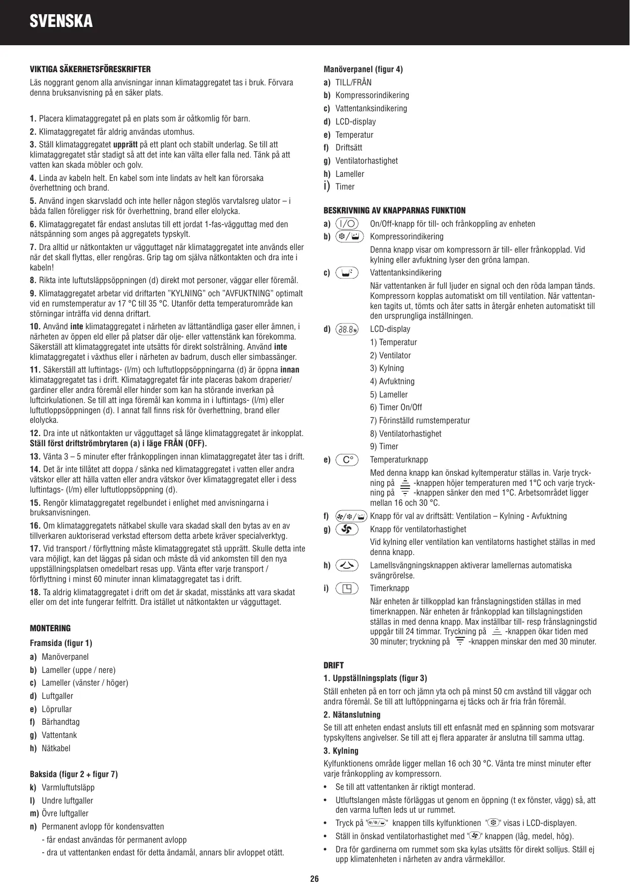 c) Lamelles (à gauche / à droite) d) Grille sortie d’air e) Rouleaux f) Poignée de transport g) Réservoir d’eau h) Câble du secteur
