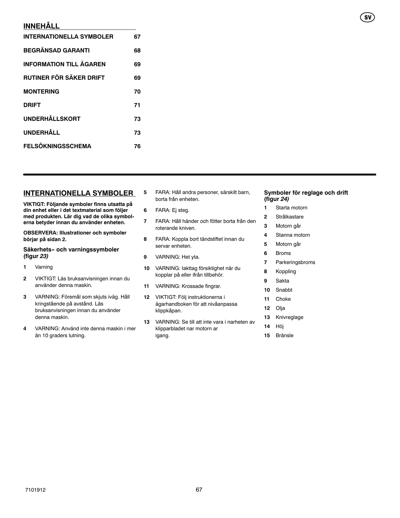6. Duw de bougiekabel weer op de bougie. Maai een korte afstand en controleer opnieuw de kwaliteit van het gemaaide gras. Zet de mesaandrijfveer (2) in het onderste gat (5), indien nodig. 7. Controleer de kwaliteit van het gemaaide gras opnieuw. Als de kwaliteit nog niet verbeterd is, moet u de maaiaandrijfriem vervangen. Als dit ook niet helpt, moet u de maaier naar een erkend service center brengen. 8. Zet de mesrotatiebediening in de DISENGAGE stand (1) en zet de motor af. 9. (Figuur 10) Controleer de werking van de mesrem. Draai de schijven met de hand en vergewis u ervan dat de remblokken (7) tegen de schijven drukken. WAARSCHUWING: Als de remblokken (7) niet stevig tegen de schijven drukken, moet u de maaier naar een erkend service center brengen. 10. (Figuur 8) Zet de mesrotatiebediening in de ENGAGE stand (2). 11. (Figuur 10) Controleer de remblokken (1) van de mesrem (7). Vervang de remblokken als ze sterk versleten of beschadigd zijn. De juiste onderdelen en assistentie zijn verkrijgbaar via een erkend service center. 12. Duw de bougiekabel weer op de bougie. Maai een korte afstand en controleer opnieuw de werking van de mesrotatie. 13. Als u de mesrotatiebediening in de DISENGAGE stand zet, moet het geheel binnen vijf seconden tot stilstand komen. Als u een nieuwe maaiaandrijfriem heeft en deze speling vertoont of het mes blijft doordraaien, moet u de mesrotatie vijf keer in- en uit-schakelen om overmatig rubber van de riem te verwijderen. Breng de maaier naar een erkend service center als u hulp nodig heeft. 7101912 3. Zorg ervoor dat de versnellingshendel in de NEUTRAL stand staat. 4. Duw de machine naar voren en zorg dat de tandwielkast vrij (in de neutrale stand) staat. 5. Breng de instelmoer (2) op één lijn met het gat in de schakelarm (3) door aan de instelmoer (2) te draaien. 6. Maak de instelmoer (2) weer vast aan de schakelarm (3). 7. Vergewis u ervan dat de NEUTRAL stand van de versnellingshendel nu overeenkomt met de werkelijke neutrale (vrij) stand van de tandwielkast.