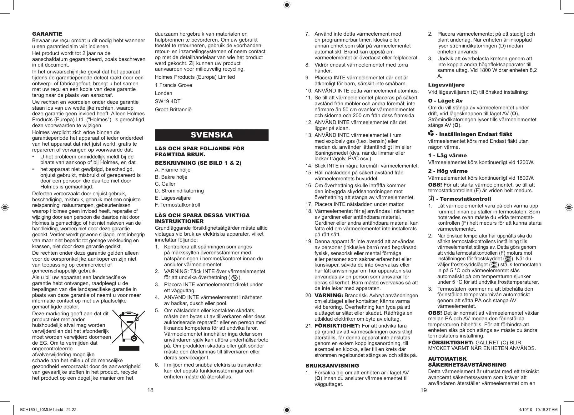 GARANTI Spara ditt kvitto, vilket krävs vid reklamation under garantitiden. Den här produkten garanteras i 2 år efter ditt inköp enligt beskrivningen i det här dokumentet. Om det osannolika skulle inträffa under garantiperioden, att apparaten slutar fungera på grund av konstruktions- eller tillverkningsfel, ska du ta den med till inköpsplatsen tillsammans med kvittot och en kopia av garantin. Rättigheter och förmåner i den här garantin gäller utöver dina lagstiftade rättigheter, som inte påverkas av garantin. Endast Holmes Products (Europe) Ltd. (“Holmes”) har rätt att ändra villkoren. Holmes åtar sig att utan kostnad reparera eller byta ut apparaten eller en del av apparaten som inte fungerar ordentligt under garantiperioden, under förutsättning att: • du omedelbart meddelar inköpsstället eller Holmes om problemet. • Apparaten inte har ändrats på något sätt eller har utsatts för skador, missbruk, felaktig användning, reparation eller modifieringar av en person annat än en person som är auktoriserad av Holmes. Garantin täcker inte fel som inträffar på grund av felaktig användning, skador, missbruk, användning med felaktigt spänning, naturfenomen, händelser som Holmes inte kan kontrollera, reparation eller ändringar av person annat än en person som är auktoriserad av Holmes eller försummelse att följa bruksanvisningen. Slitage vid normal användning täcks inte heller av garantin, inklusive, men inte begränsat till, mindre missfärgningar och repor. Rättigheterna i den här garantin gäller endast den ursprungliga köparen och avser inte kommersiellt eller offentligt bruk. Om din apparat innefattar en landsspecifik garanti eller garantibilaga, ska du läsa villkoren i den garantin i stället för den här garantin eller kontakta din lokala auktoriserade försäljare för mer information. Denna symbol betyder att produkten inte får kastas bland hushållssopor men skall bortskaffas separat inom EU. För att skydda miljön och människors hälsa från okontrollerad bortskaffning av sopor som innehåller farliga ämnen skall produkten återvinnas. Var god lämna in apparaten på en insamlingsplats för