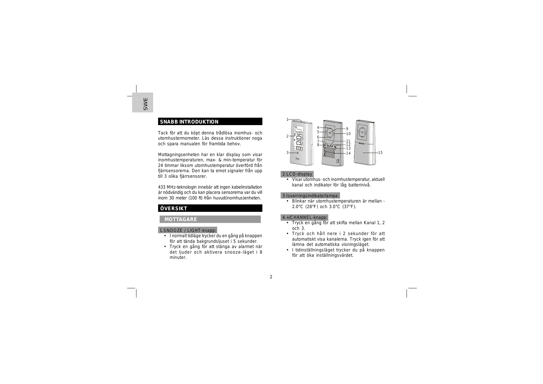 SNABB INTRODUKTION Tack för att du köpt denna trådlösa inomhus- och utomhustermometer. Läs dessa instruktioner noga och spara manualen för framtida behov.