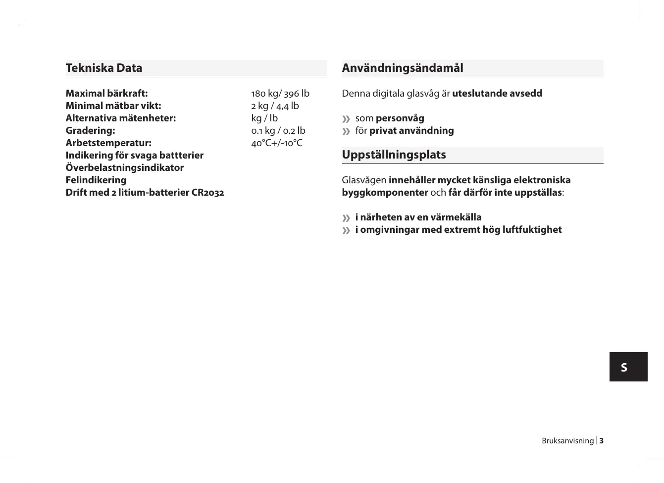 | Bruksanvisning Tekniska Data Maximal bärkraft: Minimal mätbar vikt: Alternativa mätenheter: Gradering: Arbetstemperatur: Indikering för svaga battterier Överbelastningsindikator Felindikering Drift med litium-batterier CR Användningsändamål kg/ lb kg / , lb kg / lb . kg / . lb °C+/-°C Denna digitala glasvåg är uteslutande avsedd » som personvåg » för privat användning Uppställningsplats Glasvågen innehåller mycket känsliga elektroniska byggkomponenter och får därför inte uppställas: » i närheten av en värmekälla » i omgivningar med extremt hög luftfuktighet