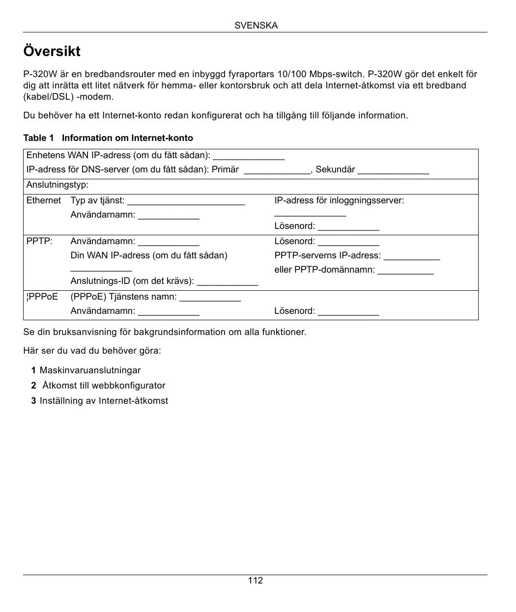 IP-adress fôr DNS-server (om du fätt sädan): Primär , Sekundär Anslutningstyp: Ethernet Typ av tjänst: IP-adress für inloggningsserver: Användarnamn: Lôsenord: PPTP: Användamamn: Lôsenord: Din WAN IP-adress (om du fâtt sädan) PPTP-serverns IP-adress:
