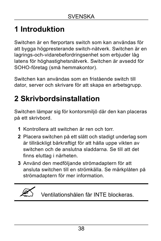 Switchen är en flerportars switch som kan användas fôr att bygga hôgpresterande switch-nätverk. Switchen är en lagrings-och-vidarebefordringsenhet som erbjuder lg latens fôr hôghastighetsnätverk. Switchen är avsedd fôr SOHO-fôretag (smä hemmakontor).