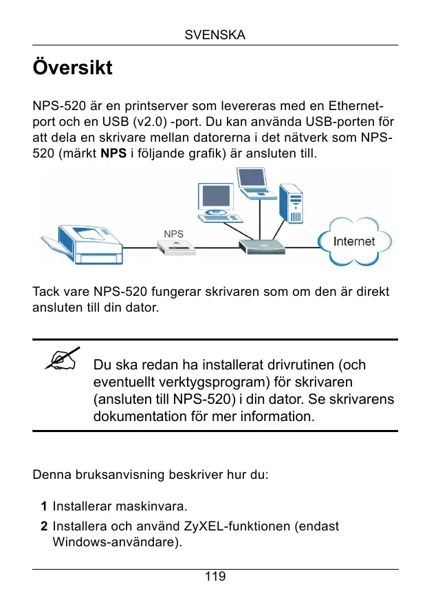 NPS-520 är en printserver som levereras med en Ethernet- port och en USB (v2.0) -port. Du kan använda USB-porten fôr att dela en skrivare mellan datorerna i det nätverk som NPS- 520 (märkt NPS i füljande grafik) är ansluten till.