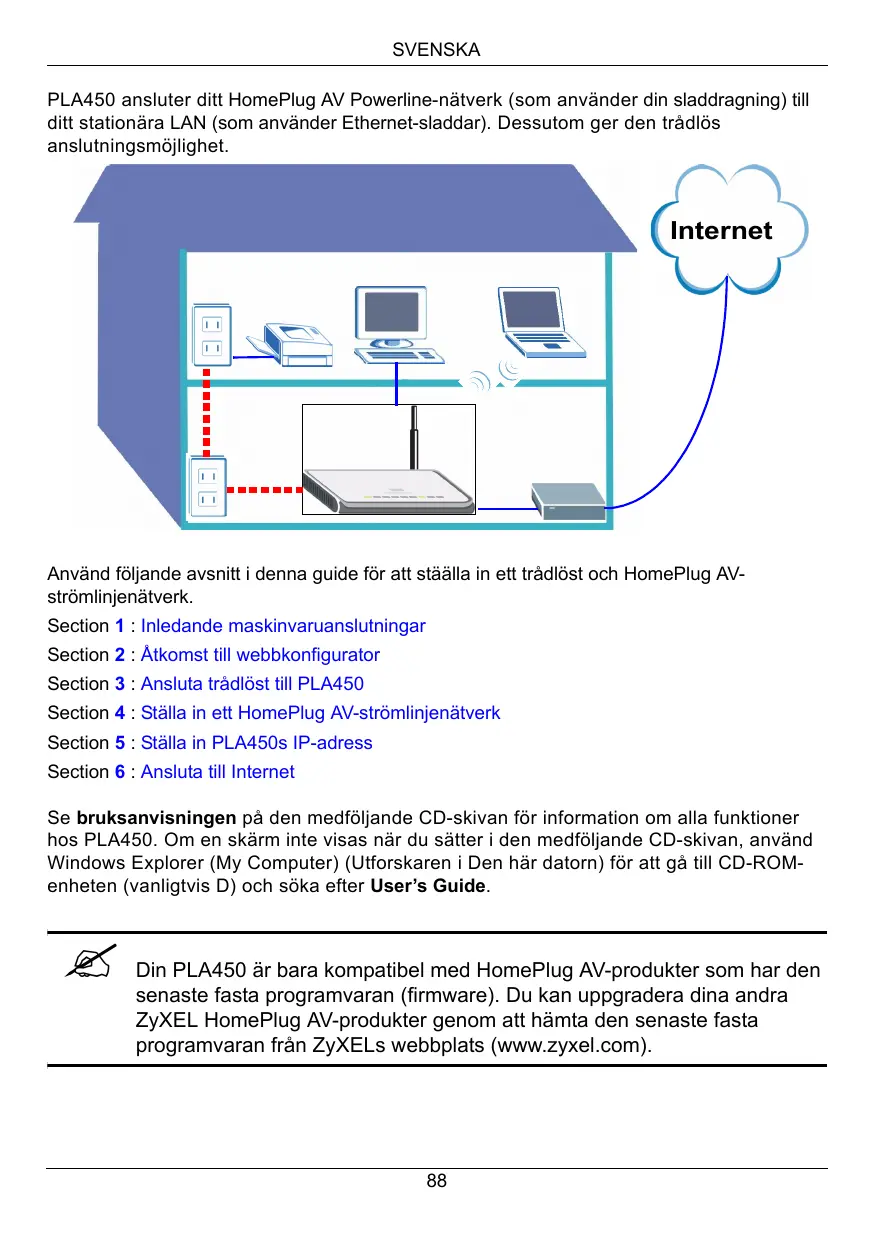 Æ Din PLA450 är bara kompatibel med HomePlug AV-produkter som har den senaste fasta programvaran (firmware). Du kan uppgradera dina andra ZyXEL HomePlug AV-produkter genom att hämta den senaste fasta programvaran frân ZyXELs webbplats (www.zyxel.com).