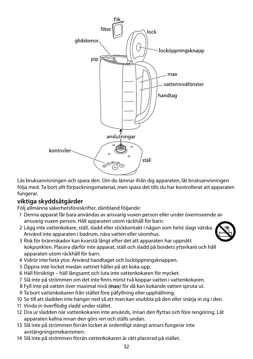 25 N'inclinez pas la bouilloire vers l'arrière, de l'eau pourrait couler sur la zone de contrôle. Si ceci se produit, laissez la bouilloire sécher avant utilisation - posez-la dans un endroit chaud pendant 12 heures.