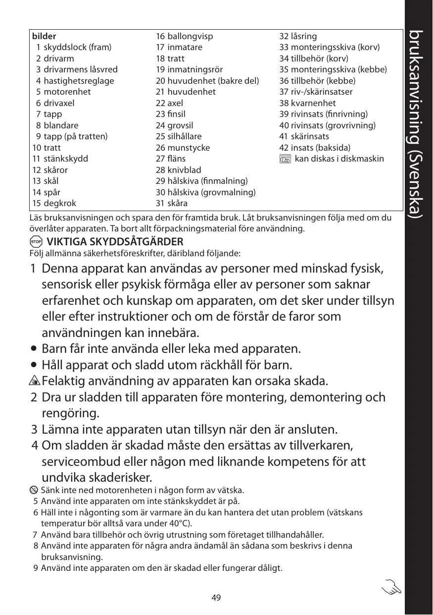 1 Denna apparat kan användas av personer med minskad fysisk, sensorisk eller psykisk fôrmäga eller av personer som saknar erfarenhet och kunskap om apparaten, om det sker under tillsyn eller efter instruktioner och om de fôrstär de faror som användningen kan innebära.