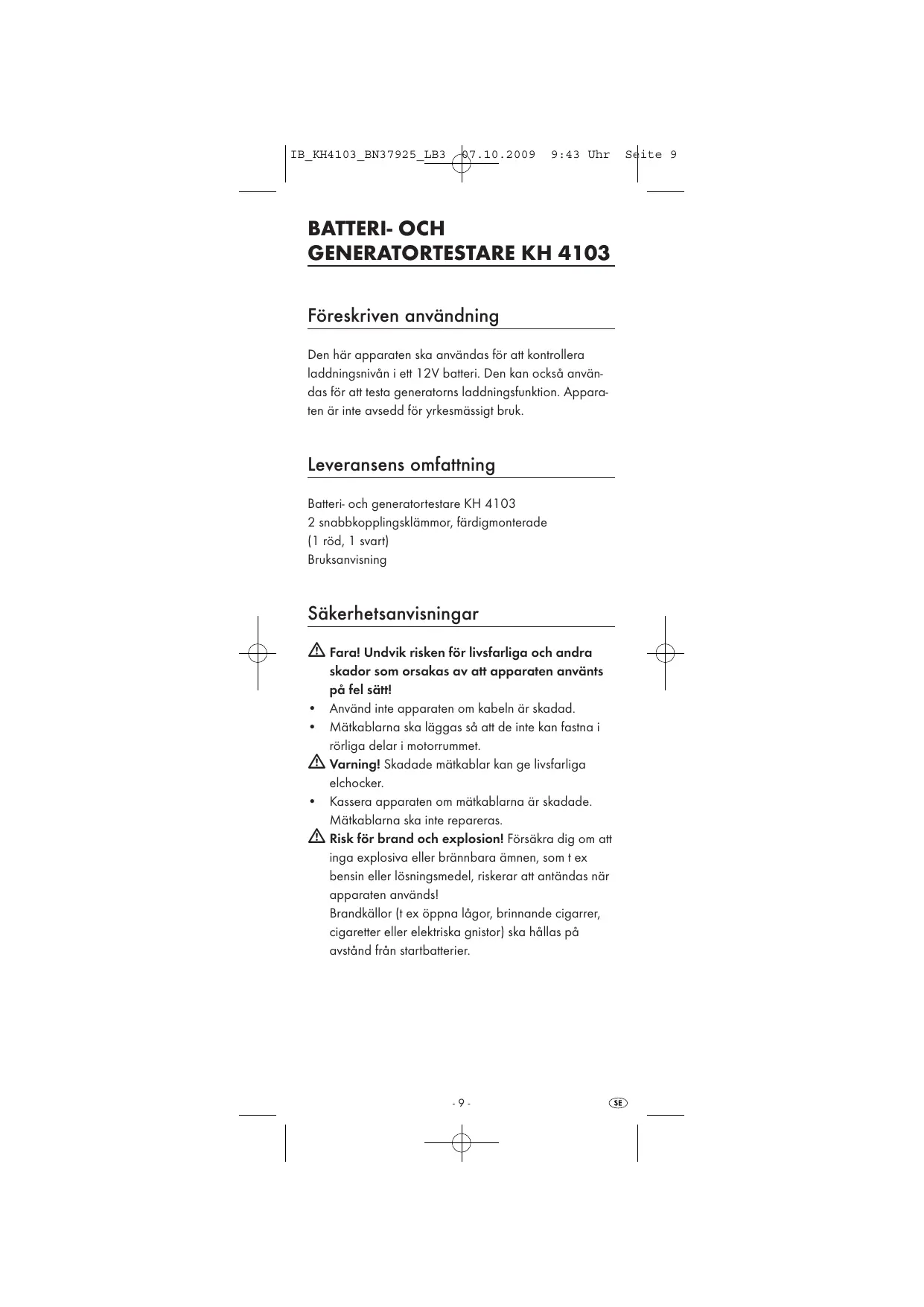 BATTERI- OCH GENERATORTESTARE KH 4103 Fôreskriven användning Den här apparaten ska användas fôr att kontrollera laddningsnivän i et 12V batteri. Den kan ocksä använ- das fôr att testa generatorns laddningsfunktion. Appara- ten är inte avsedd fôr yrkesmässigt bruk. Leveransens omfattning Batteri- och generatortestare KH 4103 2 snabbkopplingsklämmor, färdigmonterade (1 ré, 1 svari) Bruksanvisning Säkerhetsanvisningar À Faral Undvik risken fr livsfarliga och andra & skador som orsakas av att apparaten använts pà fel sättl + Använd inte apparaten om kabeln är skadad. + Mätkablarna ska läggas sà att de inte kan fasina i rôrliga delar i motorrummet À Varning! Skadade mätkablar kan ge livsfarliga elchocker. + Kassera apparaten om mätkablarna är skadade Mätkablarna ska inte repareras. À Risk fôr brand och explosion! Fôrsäkra dig om at inga explosiva eller brännbara ämnen, som t ex bensin eller lôsningsmedel, riskerar at antändas när apparaten används! Brandkällor {ex ëppna lägor, brinnande cigarrer, cigaretter eller elektriska gnistor) ska hällas pà avständ frän startbatterier.