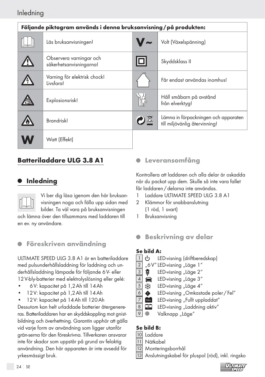 BRUKSANVISNING ULG 3.8 A1 BATTERY CHARGER ULTIMATE SPEED
