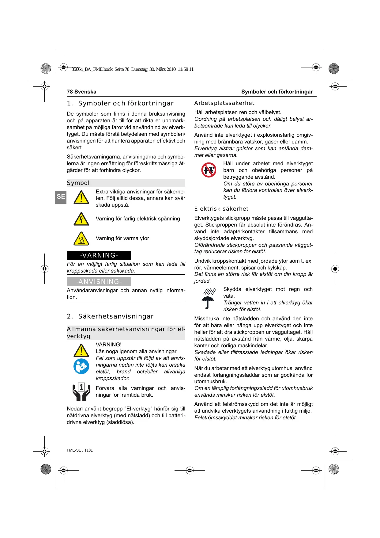 Den ofullbordade maskinen överensstämmer dessutom alla bestämmelserna i direktiven Lågspänningsdirektivet (2006/95/EG) och Elektromagnetisk kompatibilitet 2004/108/EC/EMC. Den ofullbordade maskinen får inte tas i drift förrän det har konstaterats att den maskin som den ofullbordade maskinen ska monteras i överensstämmer med bestämmelserna enligt maskindirektivet (2006/42/EG). Tillverkaren förpliktar sig att på elektronisk väg begära ut de specifika dokument som gäller för ofullbordade maskiner i det aktuella landet. De speciella tekniska dokumenten för maskinen enligt bilaga VII del B. Namn på dokumentationsansvarig: Klemens Müller, Wolfgang Auch Adress på den dokumentationsansvarige: se adressen till tillverkaren Bisingen, Mars 2010 Datum Mars 2010 Datum Klemens Müller - Quality & Process Representative - Underskrift Wolfgang Auch - Technical Director - Underskrift FME-SE / 1101 35664_BA_FME.book Seite 88 Dienstag, 30. März 2010 11:58 11 Alkuperäiset ohjeet “Jyrsintä- ja hiontamoottori“ 88 Suomi Symbolit ja lyhennykset