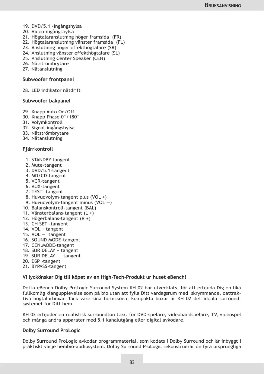BRUKSANVISNING KH 02 DOLBY PROLOGIC SURROUND SYSTEM EBENCH