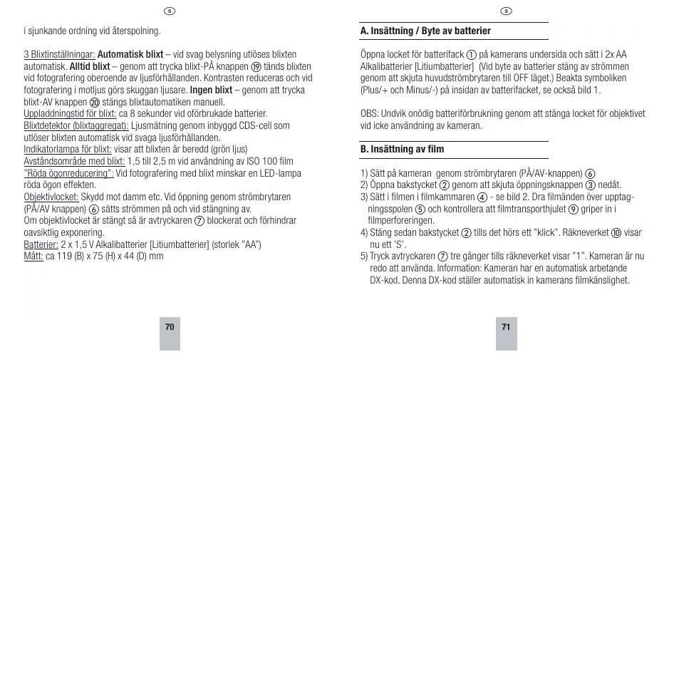 Stäng av strommen (PÄ/AV knapp ⑥) om du inte använder kameran for att undvika onödig batteriförbrukning och skydda objektivet mot damm och smuts. Ta ur batterierna om kameran inte skä användas under en langre tid. Skydda kameran mot regn, fukt, hög temperatur och solljus (forvara aldrig kameran erller filmer i bilen).