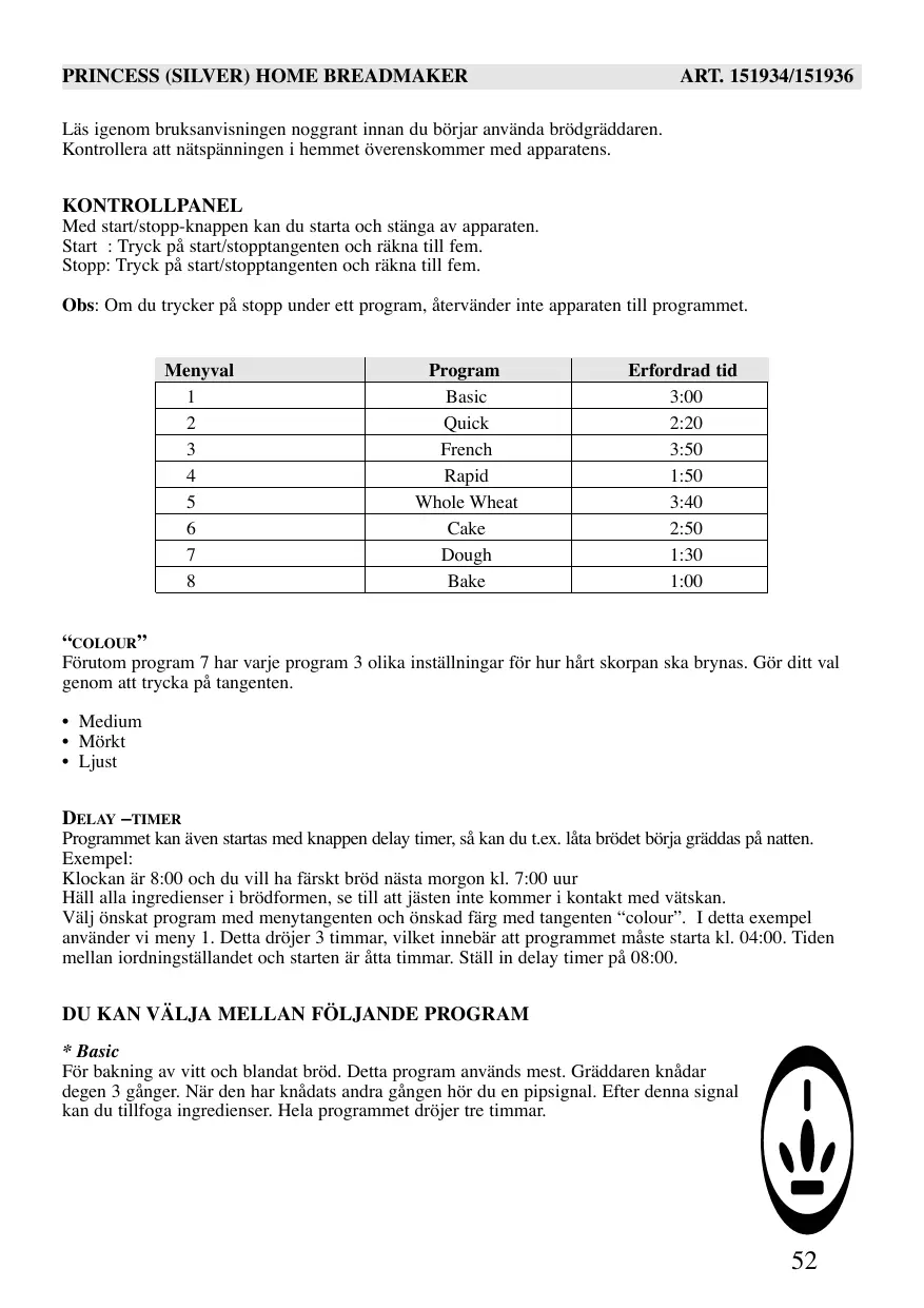 DU KAN VÄLJA MELLAN FÖLJANDE PROGRAM * Basic För bakning av vitt och blandat bröd. Detta program används mest. Gräddaren knådar degen 3 gånger. När den har knådats andra gången hör du en pipsignal. Efter denna signal kan du tillfoga ingredienser. Hela programmet dröjer tre timmar.
