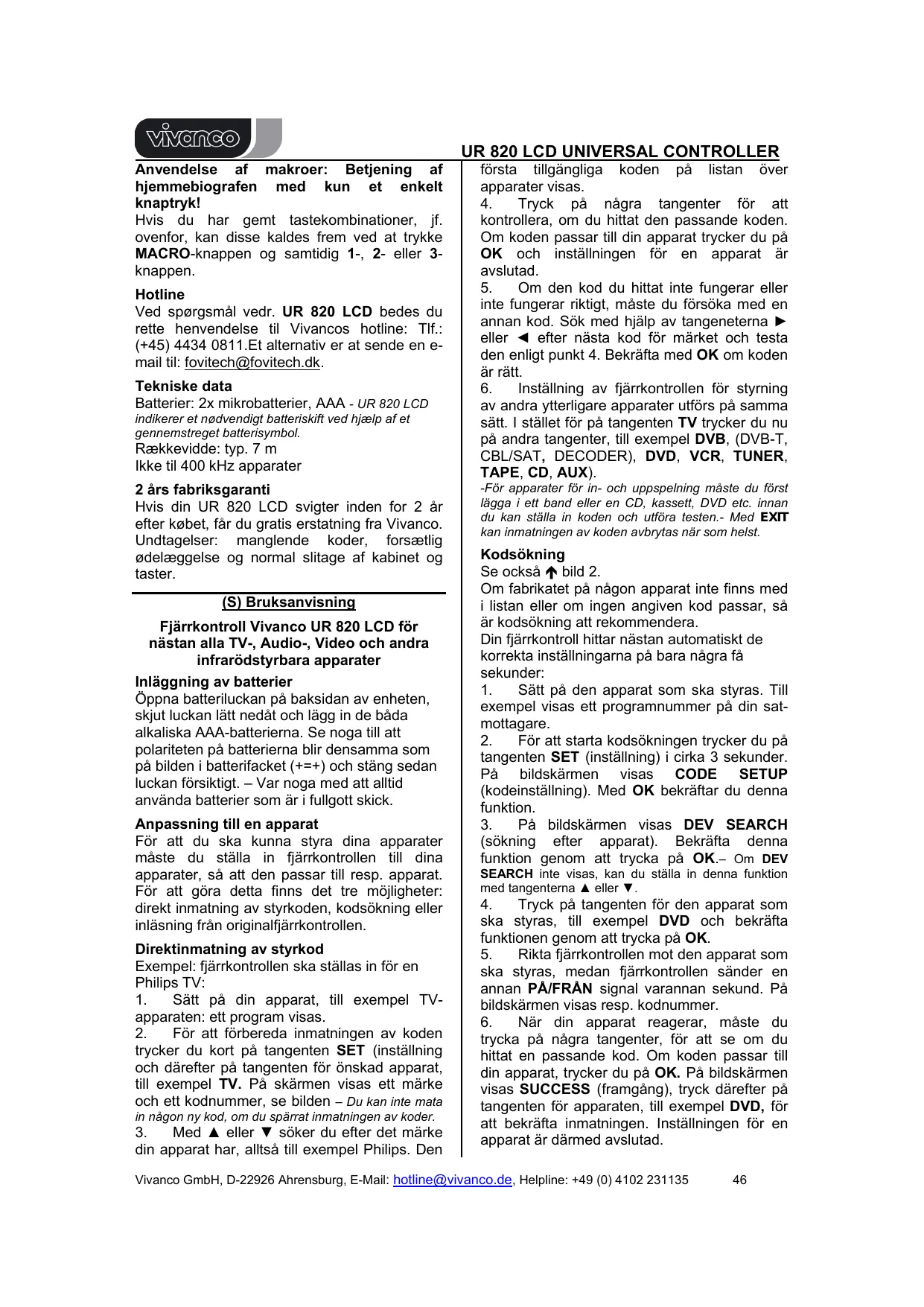 BRUKSANVISNING UNIVERSAL CONTROLLER UR 820 LCD VIVANCO
