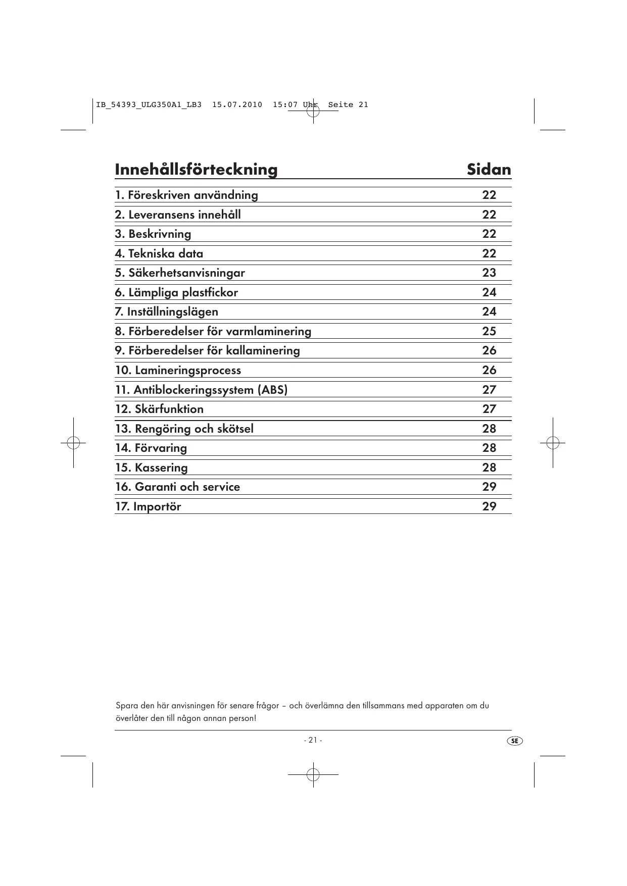 Den här lamineringsapparat är endast avsedd ait användas fôr varm- och kallaminering av pappersdo- kument eller papp à privata hushäll. Den kan dessu- tom användas fér att beskära dokument. Den är inte avsedd att användas fôr laminering av andra material. Den är inte heller avsedd fôr yrkes- mässigt eller industriellt bruk. Tillverkaren ansvarar inte fôr nägon form av skada som är ett resultat av att apparaten använts pà fel sättl