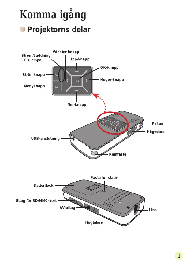 Komma igång Projektorns delar Ström/Laddning LED-lampa