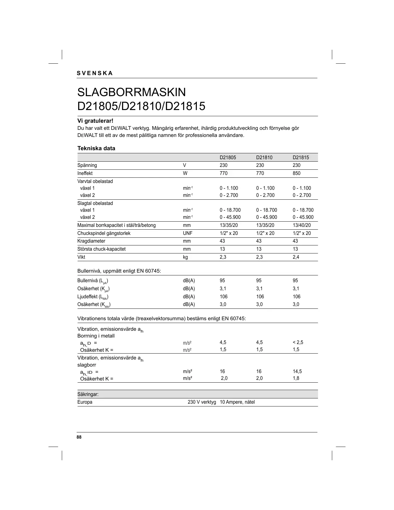 SVENSKA SLAGBORRMASKIN D21805/D21810/D21815 Vi gratulerar! Du har valt ett DEWALT verktyg. Mångårig erfarenhet, ihärdig produktutveckling och förnyelse gör DEWALT till ett av de mest pålitliga namnen för professionella användare. Tekniska data D21805 D21810 D21815 Spänning