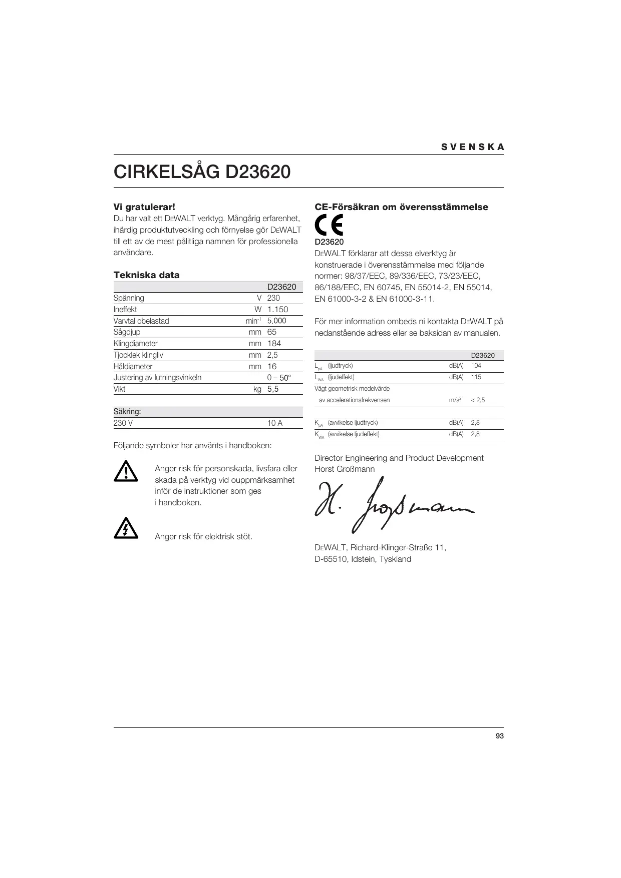 m/s2 < 2,5 Vägt geometrisk medelvärde av accelerationsfrekvensen Säkring: 230 V 10 A KpA (avvikelse ljudtryck) dB(A) 2,8 KWA (avvikelse ljudeffekt) dB(A) 2,8 Följande symboler har använts i handboken: Anger risk för personskada, livsfara eller skada på verktyg vid ouppmärksamhet inför de instruktioner som ges i handboken. Director Engineering and Product Development Horst Großmann Anger risk för elektrisk stöt. DEWALT, Richard-Klinger-Straße 11, D-65510, Idstein, Tyskland