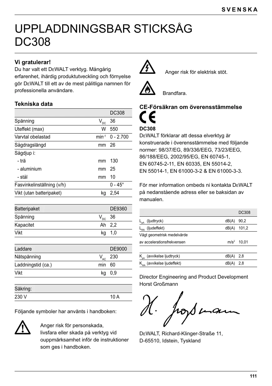 DC308 DEWALT förklarar att dessa elverktyg är konstruerade i överensstämmelse med följande normer: 98/37/EG, 89/336/EEG, 73/23/EEG, 86/188/EEG, 2002/95/EG, EN 60745-1, EN 60745-2-11, EN 60335, EN 55014-2, EN 55014-1, EN 61000-3-2 & EN 61000-3-3. För mer information ombeds ni kontakta DEWALT på nedanstående adress eller se baksidan av manualen. DE9360 Spänning VDC 36 Kapacitet Ah 2,2 Vikt kg 1,0 DC308 LpA (ljudtryck) dB(A) 90,2 LWA (ljudeffekt) dB(A) 101,2 Vägt geometrisk medelvärde av accelerationsfrekvensen Laddare m/s2 10,01 DE9000 Nätspänning VAC 230 KpA (avvikelse ljudtryck) dB(A) 2,8 Laddningstid (ca.) min 60 KWA (avvikelse ljudeffekt) dB(A) 2,8 Vikt kg 0,9 Säkring: 230 V Director Engineering and Product Development Horst Großmann 10 A Följande symboler har använts i handboken: