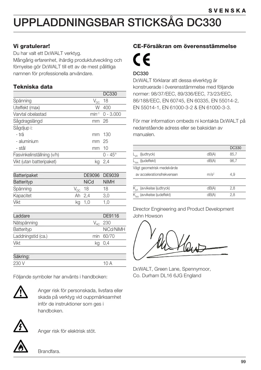 kg 2,4 DC330 DEWALT förklarar att dessa elverktyg är konstruerade i överensstämmelse med följande normer: 98/37/EEC, 89/336/EEC, 73/23/EEC, 86/188/EEC, EN 60745, EN 60335, EN 55014-2, EN 55014-1, EN 61000-3-2 & EN 61000-3-3. För mer information ombeds ni kontakta DEWALT på nedanstående adress eller se baksidan av manualen. DC330 LpA (ljudtryck) dB(A) 85,7 LWA (ljudeffekt) dB(A) 96,7 m/s2 4,9 KpA (avvikelse ljudtryck) dB(A) 2,8 KWA (avvikelse ljudeffekt) dB(A) 2,8 Vägt geometrisk medelvärde Batteripaket Batterityp Spänning Kapacitet Vikt DE9096 NiCd VDC 18 Ah 2,4 kg 1,0 Laddare Nätspänning Batterityp Laddningstid (ca.) Vikt DE9039 NiMH 3,0 1,0 DE9116 VAC 230 NiCd/NiMH min 60/70 kg 0,4 Säkring: 230 V av accelerationsfrekvensen Director Engineering and Product Development John Howson 10 A Följande symboler har använts i handboken: DEWALT, Green Lane, Spennymoor, Co. Durham DL16 6JG England Anger risk för personskada, livsfara eller skada på verktyg vid ouppmärksamhet inför de instruktioner som ges i handboken. Anger risk för elektrisk stöt. Brandfara.