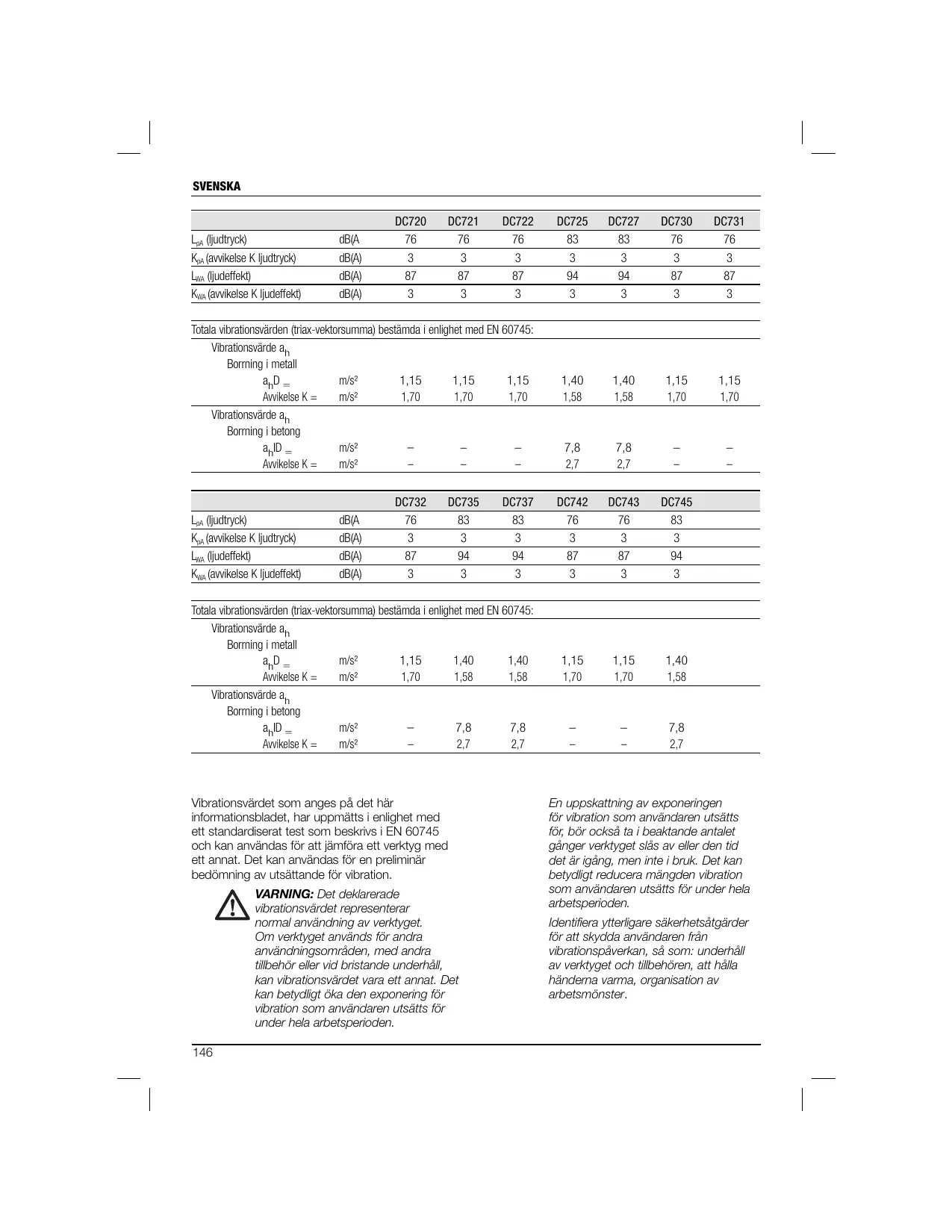 Vibrationsvardet som anges på det här informationsbladet, har uppmàttis i enlighet med att standardiserat test som beskrivs i EN 60745 och kan anvandas for att jämföra ett verktyg med att annat. Det kan anvandas for en preliminär bedömning av utsättande für vibration.