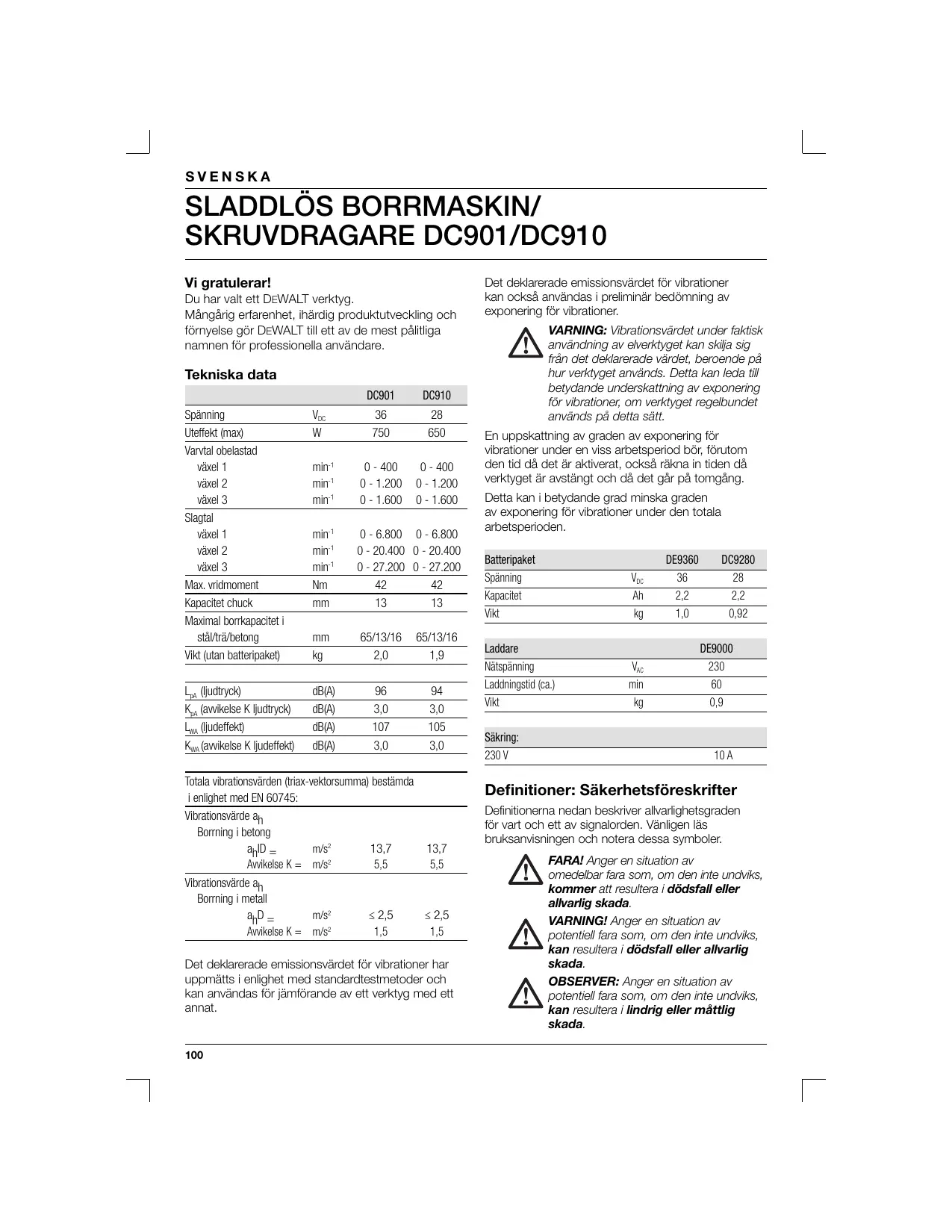 Vi gratulerar! Du har vait ett DEWALT verktyg. Mängärig erfarenhet, inärdig produktutvecking och fôrnyelse gôr DEWALT till ett av de mest pälitiga namnen fèr professionella användare. Tekniska data DC901 DC910 Spänning Ve 36 28 Uteffekt (ma) w 750 650 Varvl obelastad värel 1 min! 0-400 0-400 värel 2 min 0-1200 0-1.200 värel 3 min'_0-1600 0-1.600 Stagtal växel 1 min 0-6800 0-6.800 värel 2 min' 0-20400 020.400 värel 3 min'_ 0-27.200 0- 27.200 Max. ridmoment Nm 42 42 Kapacitt chuck mm 13 13 Maximal borrkapacitet stälträ/betong mm__ 651316 65/13/16 Vikt (utan batteripake) kg 20 19 L Gudtych A) 96 94 KA (awikelse K Judtryck) — dB(A) 30 30 Lu Gjudeffeky) (A) 107 105 Ka tawikelse K Judeffek) — dB(A) 30 30 Totala vibrationsvärden (riax-vektorsumma) bestämca j'enlighet med EN 60745: Vibrationsärde ap, Borning i betong aD= mé 137 137 Awikeise K= ms’ 55 55 Vibrationsärde ap, Borning i metal ap = ms £25 <25 Anikelse K = ms2 15 15 Det dekiarerade emissionsvärdet fôr vibrationer har uppmätts i enlighet med standardtestmetoder och kan användas fôr jämférande av ett verktyg med ett annat. Det deklarerade emissionsvärdet fôr vibrationer kan ocksä användes i preliminär bedômning av exponering fôr vibrationer. VARNING: Vibrationsvärdet under faktisk VAN användhning av elverktyget kan skija sig fin det deklarerade vârdet, beroende pà hur verktyget används. Detta kan led til betydande underskattning av exponering fé vibrationer, om verkyget regelbundet använas pä detta sätt. En uppskatning av graden av exponering fôr vibrationer under en viss arbetsperiod bôr, fôrutom den tid dà det är aktiverat, ocksä räkna in tiden dà verktyget är avstängt och dà det gär pà tomgäng. Detta kan i betycande grad minska graden av exponering fôr vibrationer under den totala arbetsperioden. Batteripaket DE9360 DC9280 Spänning Ve # 2 Kapactet A 22 22 Un CE 022 Laddare DE9000 Nspänning 230 Ladüningstid Ça) min 60 Un Kg 09 Säkring Z0v 10A oner: Säkerhetsfôreskrifter Definitionema nedan beskriver allvarighetsgraden fôr vart och ett av signalorden. Vänligen läs bruksanvisningen och notera dessa symboler. FARAI Anger en situation av omedelbar fara som, om den inte undwiks, kommer att resuitera i dôdsfall eller allvarlig skada. VARNINGI Anger en situation av VAN potentiel! fara som, om den inte undviks, kan resultera i dédsfall eller allvarlig skada. OBSERVER: Anger en situation av VAN potentiel fara som, om den inte unaviks, kan resultera i lindrig eller mâttlig skada.