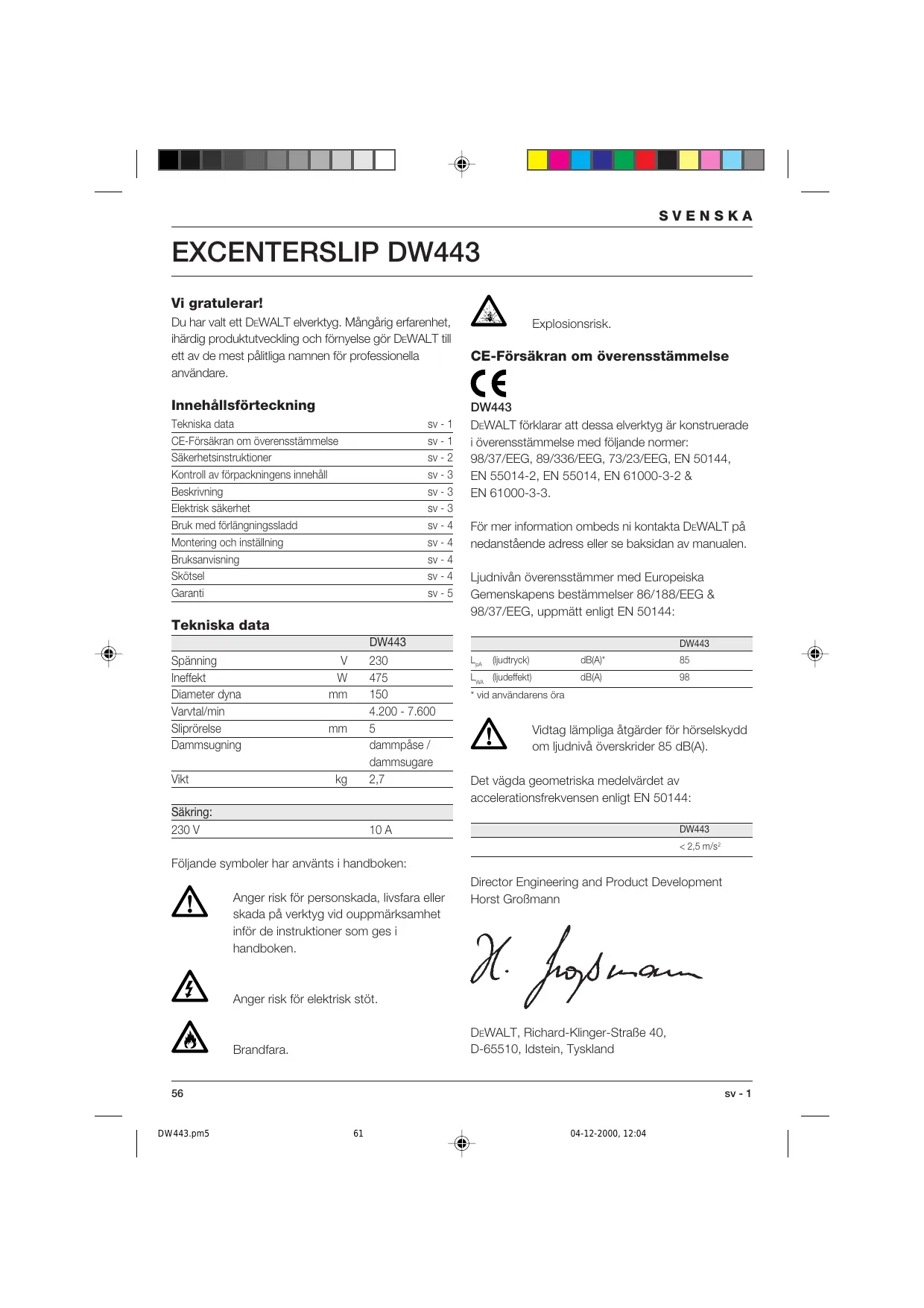 SVENSKA EXCENTERSLIP DW443 Vi gratulerar! VAN Du har valt ett DEWALT elverktyg. Mängärig erfarenhet, Explosionsrisk. ihärdig produktutvecking och fômyelse gôr DEWALT til ett av de mest pältiga namnen fôr professionella CE-Fôrsäkran om ôverensstämmelse användare. C € Innehälisfôrteckning DW443 Tekniska data Sv-1 DEWALT fôrklarar att dessa elverktyg är konstruerade CE-Forsäkran om overensstammelse sv- 1 i éverensstämmelse med fôjande normer: Säkerhetsinstruktioner sv-2 98/37/EEG, 89/336/EEG, 73/23/EEG, EN 50144, Kontrol av Forpackningens innehäl Sv-3 EN56014-2, EN 55014, EN 61000-3-2 & Beskrivning Sv-3 EN61000-3-8. Elektrisk säkernet sv-3 Bruk med fürlängningssladd Sv-4 Für mer information ombeds ni kontakta DEWALT pà Montering och inställning SV-4 nedanstäende adress eller se baksidan av manualen. Erksanwsring sv-4 Skôtsel Sv-4 Ljudnivän ôverensstämmer med Europeiska Garanti Sv-5 Gemenskapens bestämmelser 86/188/EEG & 98/37/EEG, uppmätt enigt EN 50144: Tekniska data DW443 DW443 Spänning V 230 La Oudnck PT 8 ineffekt W__475 TE] EE) E: Diameter dyna mm 180 Fid användarens dr Varvtal/min 4.200 - 7.600 Siproreise mm 5 VAN Vidtag lämpliga étgärder fôr hôrselskyciai Dammsugning dammpäse / om ljudnivà ôverskrider 85 dB({A). dammsugare vk Kg_ 27 Det vägda geometriska medelvärdet av accelerationsfrekvensen enligt EN 50144: SEking: 230 V 10A DW443 <25 ms Fülande symboler har använts i handboken: Director Engineering and Product Development ÂÀ Anger risk fôr personskada, livsfara ler Horst Groëmann skada pâ verktyg vid ouppmärksamhet infôr de instruktioner som ges i handhoken. : VAT s PU Anger risk fôr elektrisk stôt. DEWALT, Richard-Klinger-StraBe 40, Brandfara. D-65510, Idstein, Tyskland