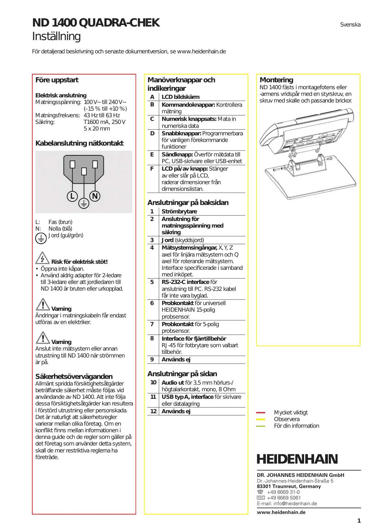 - Pulsar la tecla ENVIAR para enviar los informes de los resultados. ND 1400 QUADRA-CHEK Inställning Svenska För detaljerad beskrivning och senaste dokumentversion, se www.heidenhain.de Före uppstart Elektrisk anslutning Matningsspänning: 100 V~ till 240 V~ (–15 % till +10 %) Matningsfrekvens: 43 Hz till 63 Hz Säkring: T1600 mA, 250 V 5 x 20 mm Manöverknappar och indikeringar