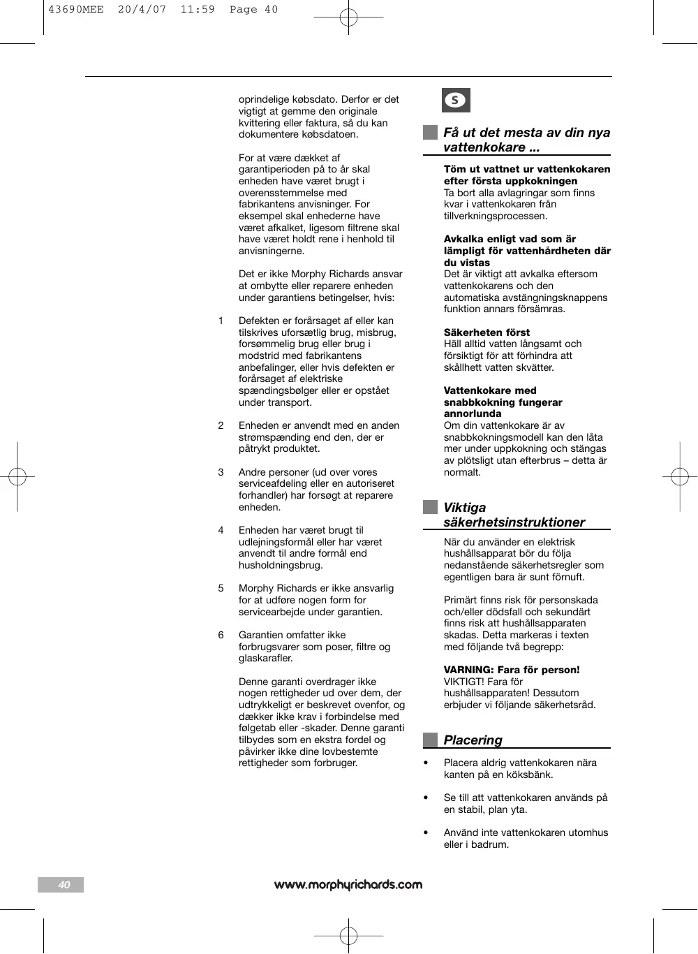 Vattenkokare med snabbkokning fungerar annorlunda Om din vattenkokare är av snabbkokningsmodell kan den låta mer under uppkokning och stängas av plötsligt utan efterbrus – detta är normalt. Viktiga säkerhetsinstruktioner När du använder en elektrisk hushållsapparat bör du följa nedanstående säkerhetsregler som egentligen bara är sunt förnuft. Morphy Richards er ikke ansvarlig for at udføre nogen form for servicearbejde under garantien. Primärt finns risk för personskada och/eller dödsfall och sekundärt finns risk att hushållsapparaten skadas. Detta markeras i texten med följande två begrepp: Garantien omfatter ikke forbrugsvarer som poser, filtre og glaskarafler. Denne garanti overdrager ikke nogen rettigheder ud over dem, der udtrykkeligt er beskrevet ovenfor, og dækker ikke krav i forbindelse med følgetab eller -skader. Denne garanti tilbydes som en ekstra fordel og påvirker ikke dine lovbestemte rettigheder som forbruger.