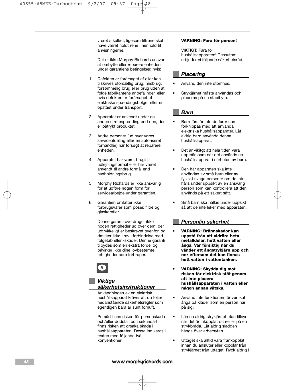 Morphy Richards skall inte vara ansvarigt för att byta ut eller reparera varorna under villkoren i garantin där: 1