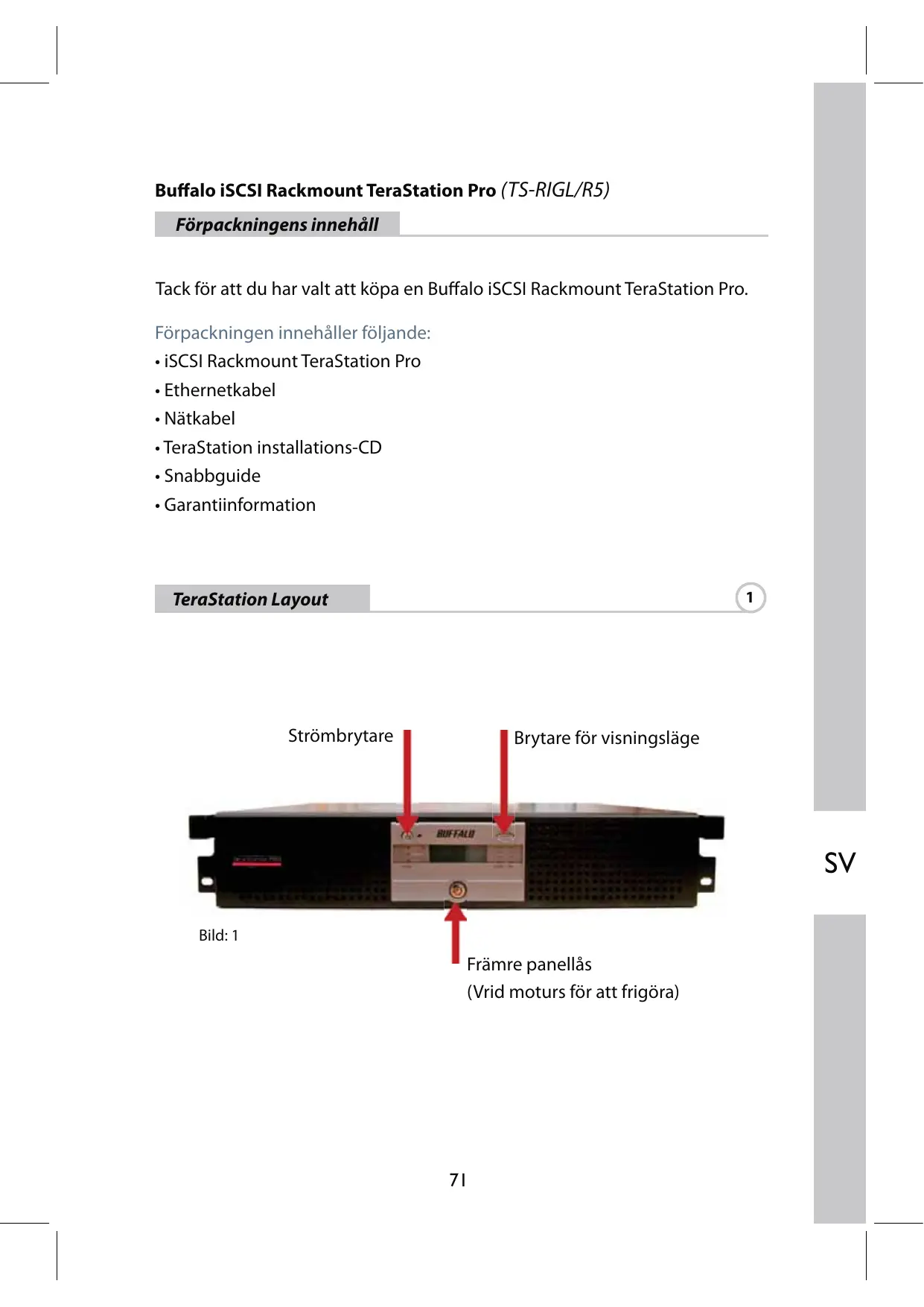 Buffalo iSCSI Rackmount TeraStation Pro (TS-RIGL/R5) Förpackningens innehåll Tack för att du har valt att köpa en Buffalo iSCSI Rackmount TeraStation Pro. Förpackningen innehåller följande: • iSCSI Rackmount TeraStation Pro • Ethernetkabel • Nätkabel • TeraStation installations-CD • Snabbguide • Garantiinformation