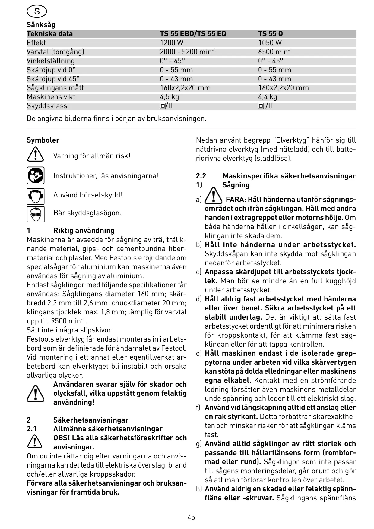 Bär skyddsglasögon. Riktig användning Maskinerna är avsedda för sågning av trä, träliknande material, gips- och cementbundna fibermaterial och plaster. Med Festools erbjudande om specialsågar för aluminium kan maskinerna även användas för sågning av aluminium. Endast sågklingor med följande specifikationer får användas: Sågklingans diameter 160 mm; skärbredd 2,2 mm till 2,6 mm; chuckdiameter 20 mm; klingans tjocklek max. 1,8 mm; lämplig för varvtal upp till 9500 min-1. Sätt inte i några slipskivor. Festools elverktyg får endast monteras in i arbetsbord som är definierade för ändamålet av Festool. Vid montering i ett annat eller egentillverkat arbetsbord kan elverktyget bli instabilt och orsaka allvarliga olyckor. Användaren svarar själv för skador och olycksfall, vilka uppstått genom felaktig användning!