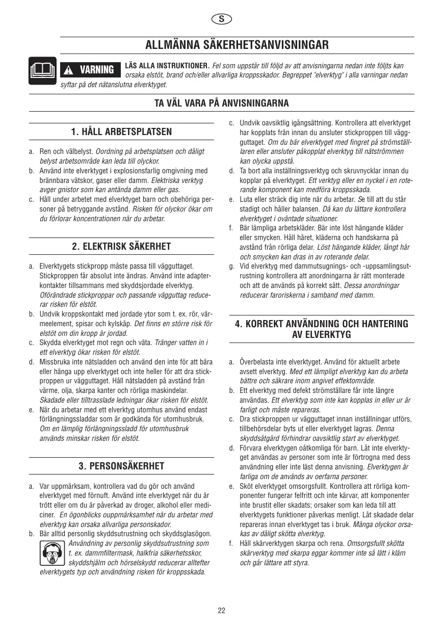 2. SECURITE ELECTRIQUE a. La fiche de l’outil électroportatif doit être appropriée à la prise de courant. Ne modifiez en aucune circonstance la fiche. N’employez pas d’adaptateur avec les outils électroportatifs mis à la terre. L’utilisation de fiches non modifiées et de prises appropriées réduira le risque de choc électrique. b Evitez tout contact corporel avec des éléments reliés à la terre, tels que tuyauterie, radiateurs, cuisinières, réfrigérateurs. La mise à la terre du corps accroît le risque de choc