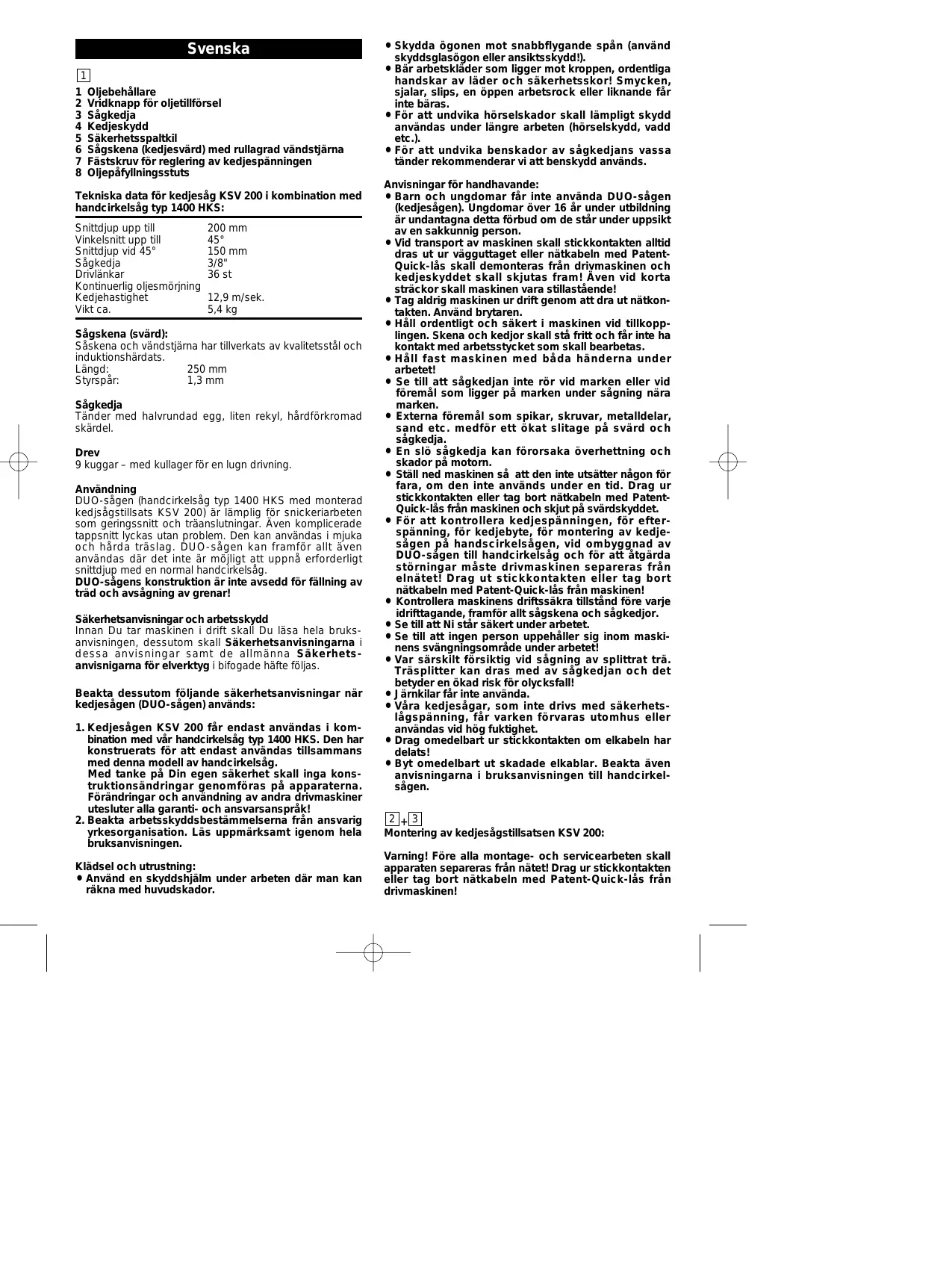 Oljebehållare Vridknapp för oljetillförsel Sågkedja Kedjeskydd Säkerhetsspaltkil Sågskena (kedjesvärd) med rullagrad vändstjärna Fästskruv för reglering av kedjespänningen Oljepåfyllningsstuts Tekniska data för kedjesåg KSV 200 i kombination med handcirkelsåg typ 1400 HKS: Snittdjup upp till Vinkelsnitt upp till Snittdjup vid 45° Sågkedja Drivlänkar Kontinuerlig oljesmörjning Kedjehastighet Vikt ca. 200 mm 45° 150 mm 3/8" 36 st 12,9 m/sek. 5,4 kg Sågskena (svärd): Såskena och vändstjärna har tillverkats av kvalitetsstål och induktionshärdats. Längd: 250 mm Styrspår: 1,3 mm Sågkedja Tänder med halvrundad egg, liten rekyl, hårdförkromad skärdel. Drev 9 kuggar – med kullager för en lugn drivning. Användning DUO-sågen (handcirkelsåg typ 1400 HKS med monterad kedjsågstillsats KSV 200) är lämplig för snickeriarbeten som geringssnitt och träanslutningar. Även komplicerade tappsnitt lyckas utan problem. Den kan användas i mjuka och hårda träslag. DUO-sågen kan framför allt även användas där det inte är möjligt att uppnå erforderligt snittdjup med en normal handcirkelsåg. DUO-sågens konstruktion är inte avsedd för fällning av träd och avsågning av grenar! Säkerhetsanvisningar och arbetsskydd Innan Du tar maskinen i drift skall Du läsa hela bruksanvisningen, dessutom skall Säkerhetsanvisningarna i dessa anvisningar samt de allmänna Säkerhetsanvisnigarna för elverktyg i bifogade häfte följas. Beakta dessutom följande säkerhetsanvisningar när kedjesågen (DUO-sågen) används: