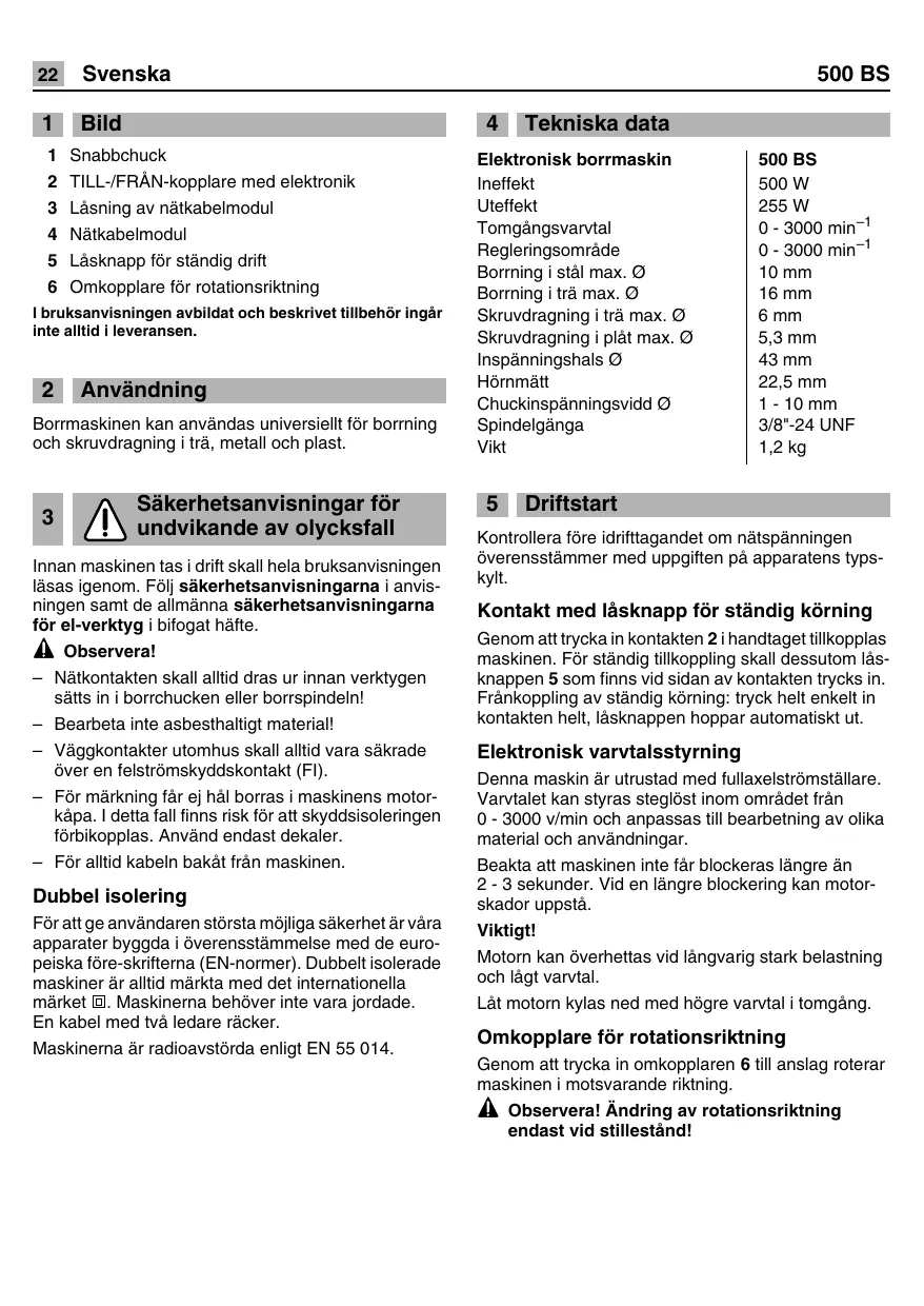 1 Bild 4 Tekniska data 1 Snabbchuck Elektronisk borrmaskin 500 BS 2 TILL/FRÂN-kopplare med elektronik Ineffekt 500 W 3 Läsning av nätkabelmodul Uteffekt 255 W 4 Nätkabelmodul Jomgéngsvantal : : 500 min”! ; as egleringsomräde - min 5 Läsknapp fôr ständig drift Bonning Si max. O 10 mm 6 Omkopplare fôr rotationsriktning Borming i tr max. @ 16 mm lbruksanvisningen avbildat och beskrivet tillbehôr ingär Skruvdragning i trà max. © 6 mm Inte alltid | laveransen. Skruvdragning i plât max. © 5,3 mm Inspänningshals 43 mm 2 Användnin Hôrnmätt 22,5 mm ÉmAtTE) Chuckinspänningsvidd © 1-10 mm Borrmaskinen kan användas universiellt fôr borrning Spindelgänga 3/8"-24 UNF och skruvdragning i trä, metall och plast. Vikt 12k9 Säkerhetsanvisningar fôr 5 Driftstart 3 undvikande av olycksfall Innan maskinen tas i drift skall hela bruksanvisningen läsas igenom. Fôl säkerhetsanvisningarna i anvis- ningen samt de allmänna säkerhetsanvisningarna fër el-verktyg i bifogat hâte. À observeral — Nätkontakten skall alltid dras ur innan verktygen sätts in i borrchucken eller borrspindeln! — Bearbeta inte asbesthaltigt material! — Väggkontakter utomhus skall alltid vara säkrade êver en felstrémskyddskontakt (F1). — Fôr märkning fâr ej häl borras i maskinens motor- käpa. | detta fall finns risk fôr att skyddsisoleringen férbikopplas. Använd endast dekaler. — Für alitid kabeln bakät frân maskinen. Dubbel isolering Fôr att ge användaren stôrsta môjliga säkerhet är vära apparater byggda i ôverensstämmelse med de euro- peiska fôre-skrifterna (EN-normer). Dubbelt isolerade maskiner är alltid märkta med det internationella märket @. Maskinerna behôver inte vara jordade. En kabel med tv ledare räcker. Maskinerna är radioavstôrda enligt EN 55 014. Kontrollera fôre idrifttagandet om nätspänningen ôverensstämmer med uppgiften pà apparatens typs- kyit. Kontakt med läsknapp fôr ständig kôrning Genom atttrycka in kontakten 2 ihandtaget tilkopplas maskinen. Fôr ständig tillkoppling skall dessutom làs- knappen 5 som finns vid sidan av kontakten trycks in. Fränkoppling av ständig krning: tryck helt enkelt in kontakten helt, läsknappen hoppar automatiskt ut. Elektronisk varvtalsstyrning Denna maskin är utrustad med fullaxelstrômställare. Varvtalet kan styras steglôst inom omrädet frän