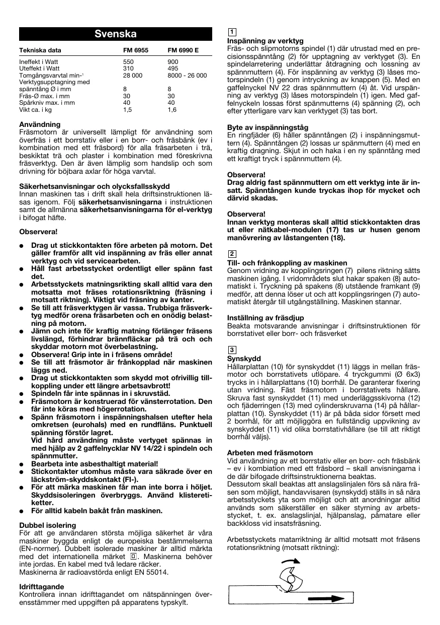 Synskydd Hållarplattan (10) för synskyddet (11) läggs in mellan fräsmotor och borrstativets utlöpare. 4 tryckgummi (Ø 6x3) trycks in i hållarplattans (10) borrhål. De garanterar fixering utan vridning. Fäst fräsmotorn i borrstativets hållare. Skruva fast synskyddet (11) med underläggsskivorna (12) och fjäderringen (13) med cylinderskruvarna (14) på hållarplattan (10). Synskyddet (11) är på båda sidor försett med 2 borrhål, för att möjliggöra en fullständig uppvikning av synskyddet (11) vid olika borrstativhållare (se till att riktigt borrhål väljs). Arbeten med fräsmotorn Vid användning av ett borrstativ eller en borr- och fräsbänk – ev i kombiation med ett fräsbord – skall anvisningarna i de där bifogade driftsinstruktionerna beaktas. Dessutom skall beaktas att anslagslinjalen förs så nära fräsen som möjligt, handavvisaren (synskydd) ställs in så nära arbetsstyckets yta som möjligt och att anordningar alltid används som säkerställer en säker styrning av arbetsstycket, t. ex. anslagslinjal, hjälpanslag, påmatare eller backkloss vid insatsfräsning. Arbetsstyckets matarriktning är alltid motsatt mot fräsens rotationsriktning (motsatt riktning): Observera! Undvik absolut fräsning i fräsens rotationsriktning!