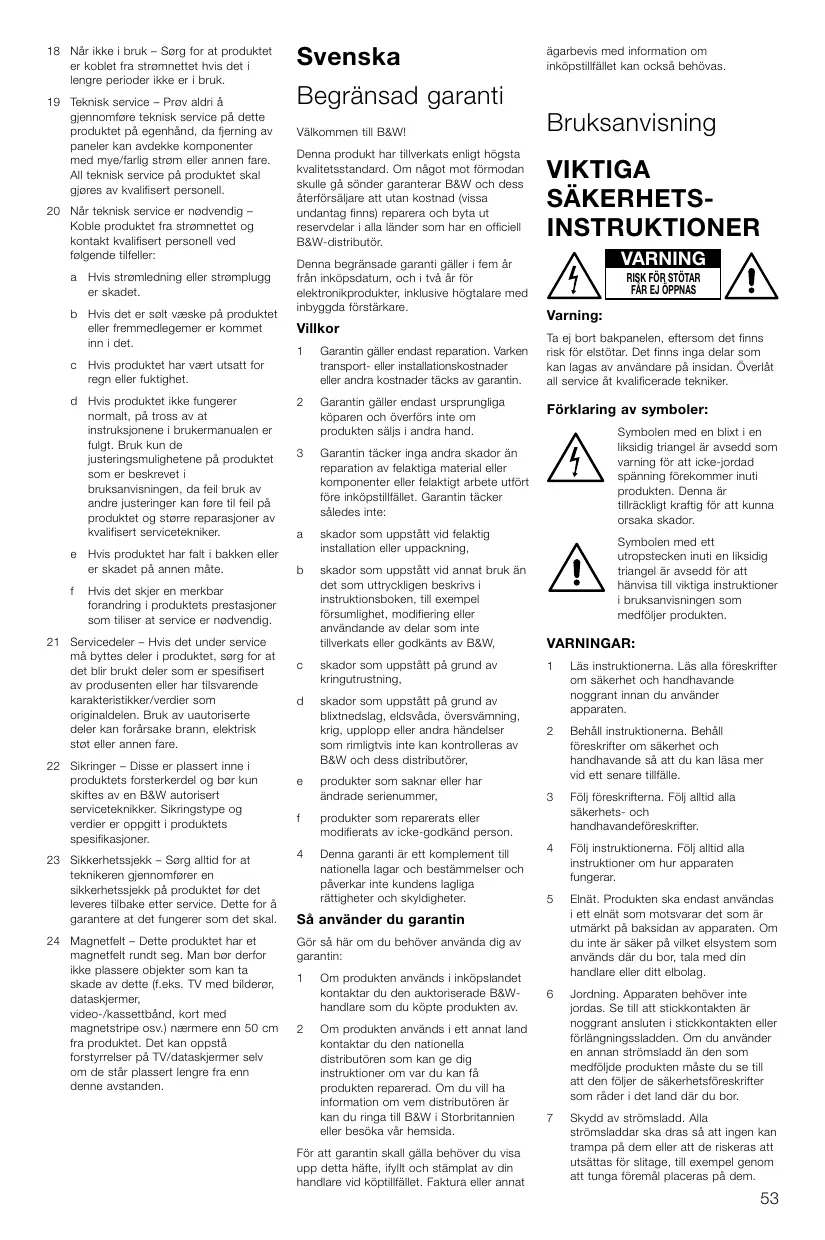 21 Reservdelar. När reservdelar behöver monteras måste de vara av exakt samma typ eller ha samma egenskaper som originaldelarna. Andra komponenter kan orsaka brand, risk för elstötar eller försämrade egenskaper. 22 Elsäkringar är placerade på insidan av förstärkaren och får endast ersättas av en auktoriserad servicetekniker som är godkänd av B&W. Vilken typ av säkring som ska användas anges i specifikationerna. 23 Säkerhetskontroll. Efter varje reparation eller service ska teknikern utföra en säkerhetskontroll av apparaten, för att försäkra sig om att apparaten fungerar på ett riktigt sätt. 24 Magnetfält. Produkten skapar ett magnetiskt fält som omger den. Placera inga föremål som kan skadas av det i detta magnetfält. Detta gäller till exempel TV-apparater och datorskärmar, kreditkort och videokassetter. Magnetfältet sträcker sig cirka 0,5 meter, men känsliga TVapparater kan påverkas även längre ifrån apparaten.